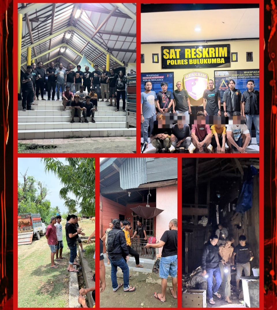BULUKUMBA — Tim gabungan dari Resmob Satreskrim dan Kamneg Satintelkam Polres Bulukumba bersama Unit Reskrim Polsek Bulukumpa berhasil mengungkap kasus pencurian ternak (curnak) yang terjadi di wilayah hukum Polsek Bulukumpa. Sebanyak lima terduga pelaku berhasil diamankan, tiga di antaranya ditangkap di wilayah Kecamatan Cina, Kabupaten Bone.