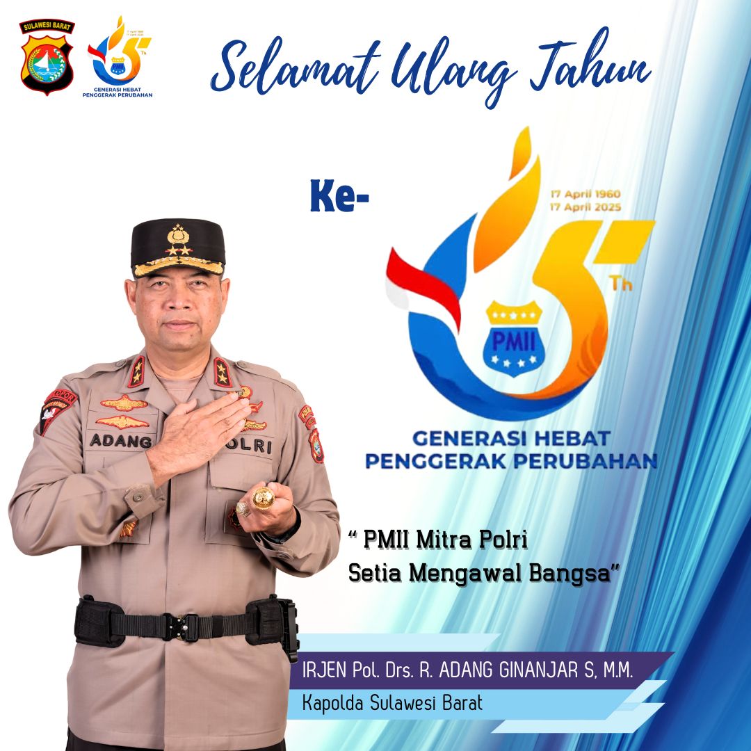 Polda Sulbar – Hari jadi Pergerakan Mahasiswa Islam Indonesia (PMII) yang ke-65 tahun mendapat apresiasi tinggi dari Kapolda Sulawesi Barat, Irjen Pol. Adang Ginanjar, yang memuji kontribusi PMII sebagai mitra strategis Polri dalam mengawal perjalanan bangsa Indonesia.