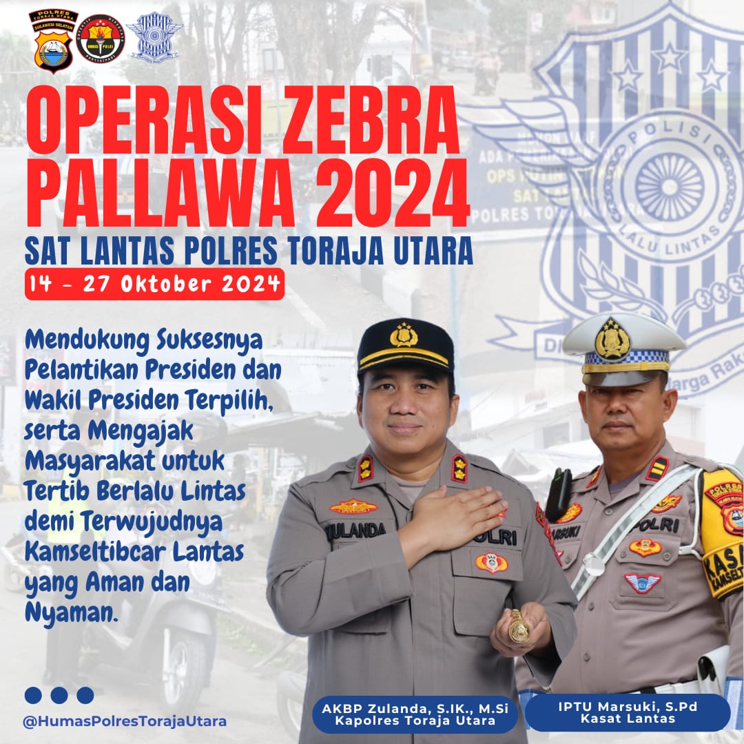 Dalam sambutannya, Kapolres Toraja Utara AKBP Zulanda, S.IK., M.Si saat membacakan amanat Kapolda Sulsel mengungkapkan bahwa pelaksanaan operasi Zebra Pallawa 2024 dilaksanakan serentak dan berlangsung dari tanggal 14 hingga 27 Oktober 2024 di seluruh wilayah hukum Polda Sulawesi Selatan.