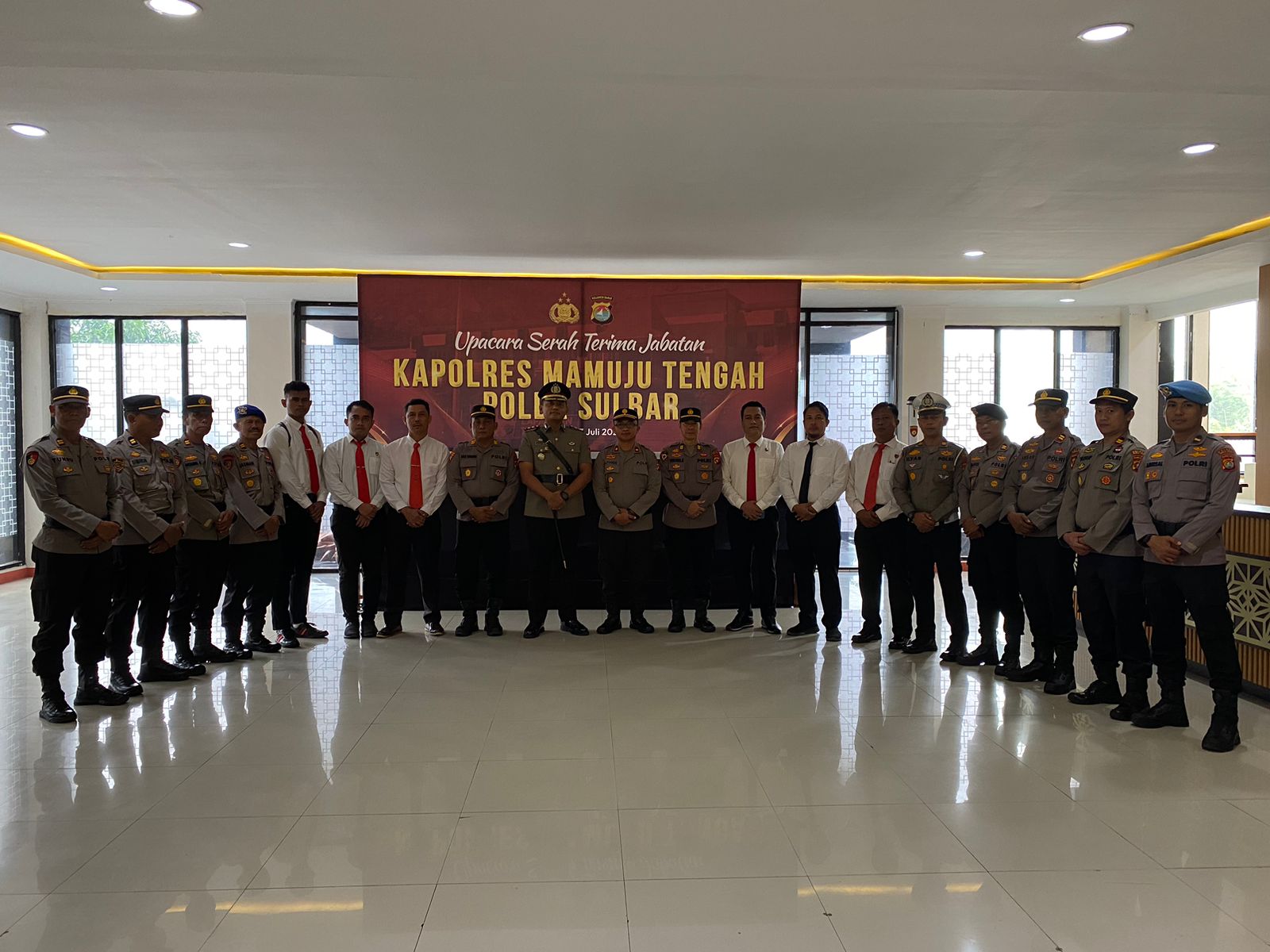 Terlihat di lobi utama Polda Sulbar, usai prosesi pelantikan AKBP Hengky langsung mengumpulkan para pejabat utamanya yang hadir dalam acara sertijab hari ini, Rabu (3/7/24).