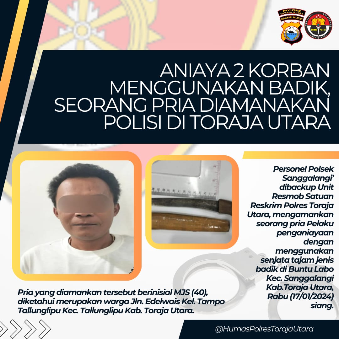 Saat dikonfirmasi, Kapolres Toraja Utara AKBP Zulanda, S.IK.,M.Si melalui Kasat Reskrim AKP Aris Saidy, SH membenarkan hal tersebut, pihaknya telah berhasil mengamanakan seorang pria pelaku penganiayaan terhadap 2 korban dengan menggunakan senjata tajam jenis badik.