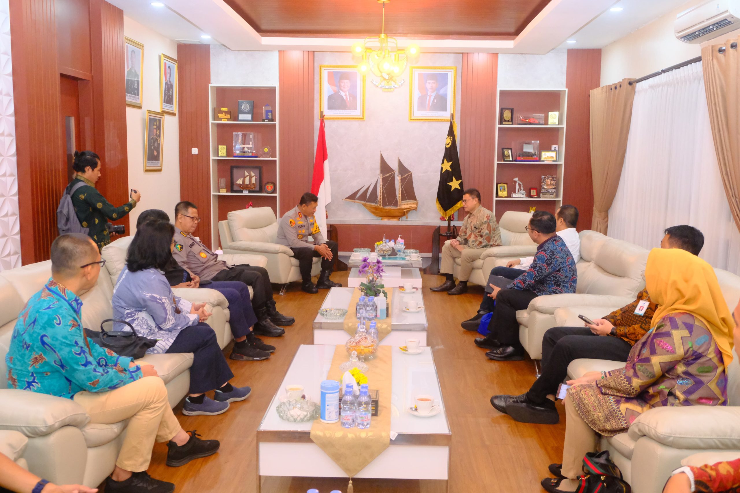 Kapolda Sulawesi Selatan Irjen Pol. Yudhiawan S.H., S.I.K., M.H., M.Si., didampingi Pejabat Utama Polda Sulsel menerima kunjungan silaturahmi Kepala Badan Pengawas Obat dan Makanan (BPOM) RI, Prof. dr. Taruna Ikrar, di Ruang Tamu Pa’rimpungan Toana Bharadaksa, Lantai 2 Mapolda Sulsel, Jumat (25/10/24). Kunjungan ini merupakan langkah awal dalam menjalin kerjasama strategis antara BPOM dan Polda Sulsel, khususnya dalam menuntaskan masalah mafia kosmetik yang marak terjadi di wilayah Sulawesi Selatan.