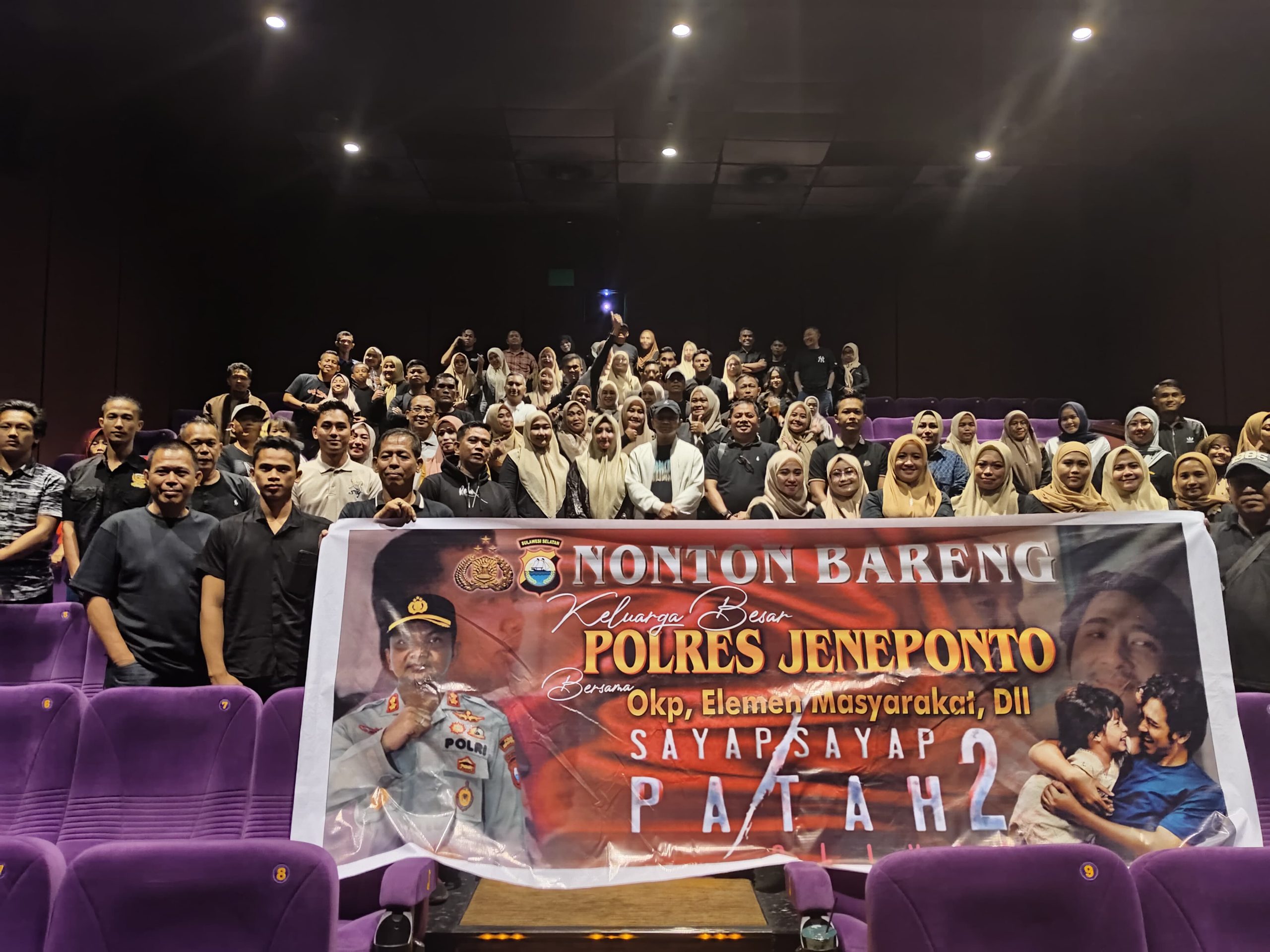 Makassar – Keluarga besar Polres Jeneponto, Polda Sulsel, dibawah pimpinan Kapolres Jeneponto AKBP Widi Setiawan, S.I.K., M.I.K., melakukan nonton bareng (nobar) film Sayap-Sayap Patah 2 di Studio XXI, Mall Trans Studio Makassar. Kegiatan ini diikuti oleh sebagian personil Polres Jeneponto dan Jajarannya beserta keluarganya. Minggu, 18/05/2025.
