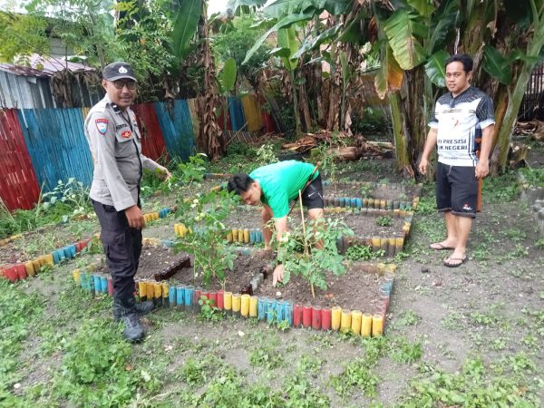 AIPTU Heriyono tampak turun langsung ke kebun bersama kepala desa dan warga setempat, Adapun tanaman yang dikembangkan dalam Taman Bergizi ini antara lain kangkung dan tomat, yang dinilai mudah dibudidayakan serta memiliki nilai gizi tinggi bagi kebutuhan keluarga.