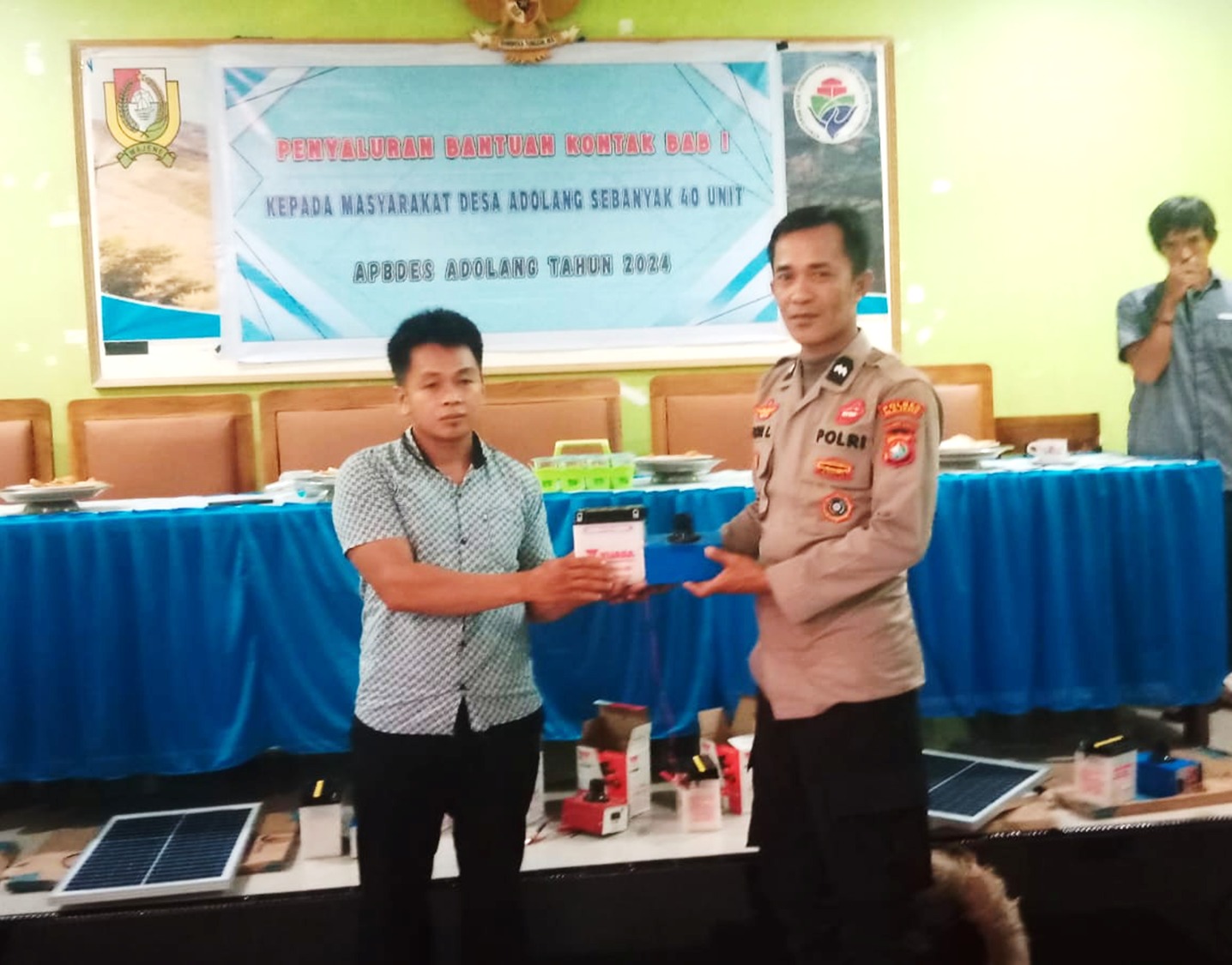 Sebanyak 40 unit bantuan diserahkan di Aula Kantor Desa Adolang dan merupakan bagian dari APBDES Adolang tahun anggaran 2024.
