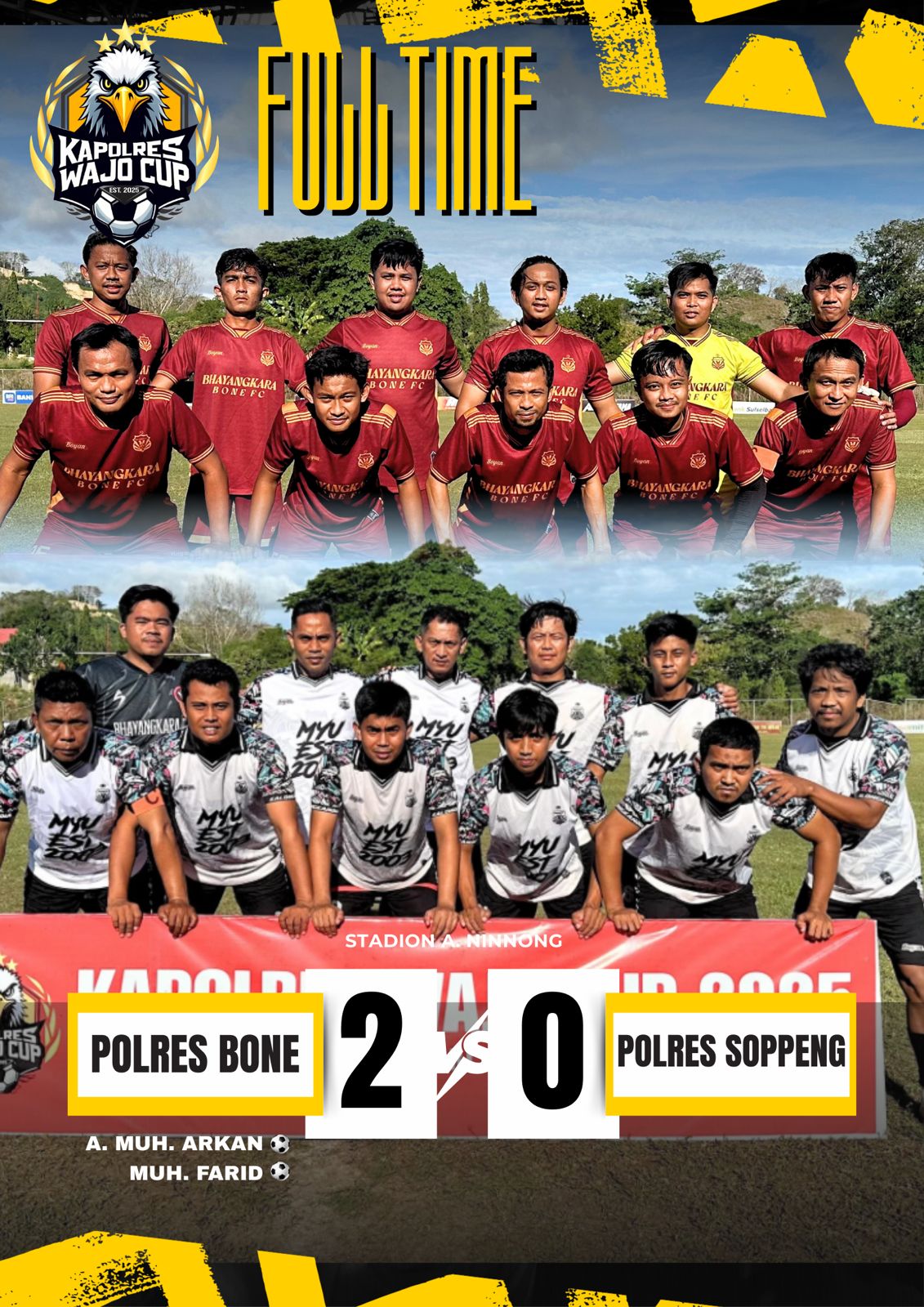 Bone – Tim Bhayangkara Bone Football Club yang dikelola langsung oleh Kasat Reskrim Polres Bone, AKP Alvin Aji K., S.Tr.K., S.IK., M.H.Li berhasil meraih kemenangan gemilang dalam turnamen Kapolres Wajo Cup 2025. Pertandingan yang berlangsung pada Sabtu (27/9/2025) pukul 16.00–18.00 Wita di Stadion A. Ninnong, Kabupaten Wajo, mempertemukan Polres Bone vs Polres Soppeng dalam rangka memeriahkan HUT RI ke-80 dan HUT Bhayangkara ke-79.