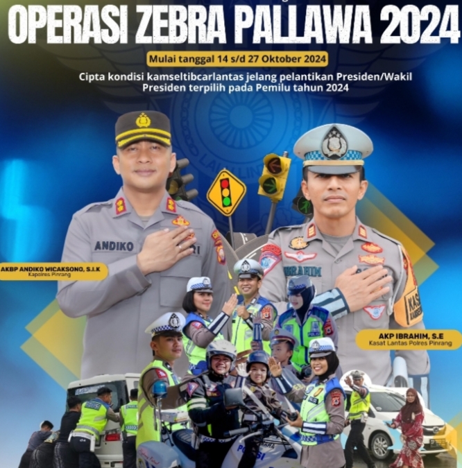 Operasi Zebra akan dilaksanakan serentak, termasuk wilayah hukum Polres Pinrang tepatnya pada hari Senin tanggal 14 hingga 27 Oktober 2024. Hal ini juga untuk Cipta Kondisi Kamseltibcarlantas jelang pelantikan Presiden/Wakil Presiden terpilih pada Pemilu Tahun 2024.