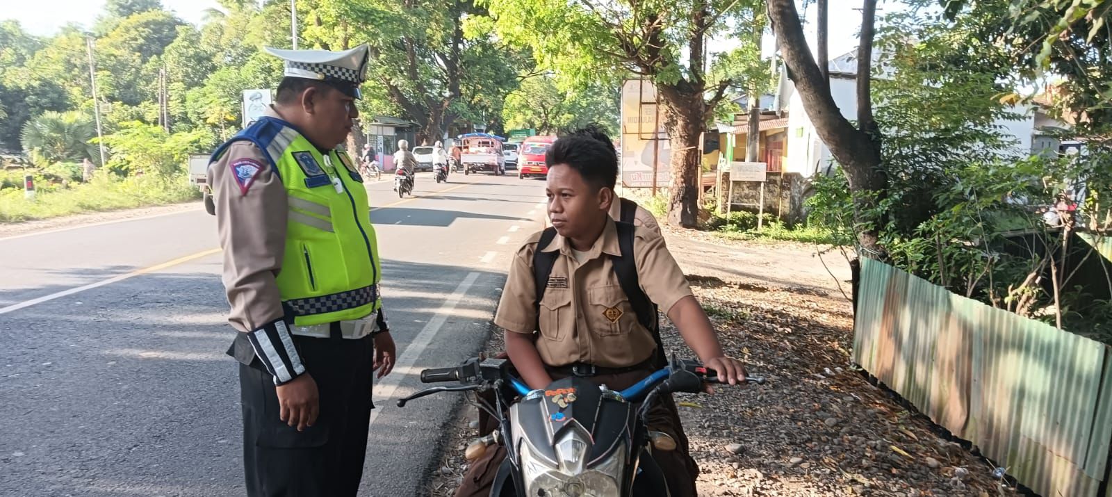Personil Satuan Lalu Lintas Polres Gowa memberikan teguran secara humanis terhadap pelajar yang ditemui mengemudikan sepeda motor dan tidak menggunakan helm saat melintas di jalan, Kamis (25/04) pagi.