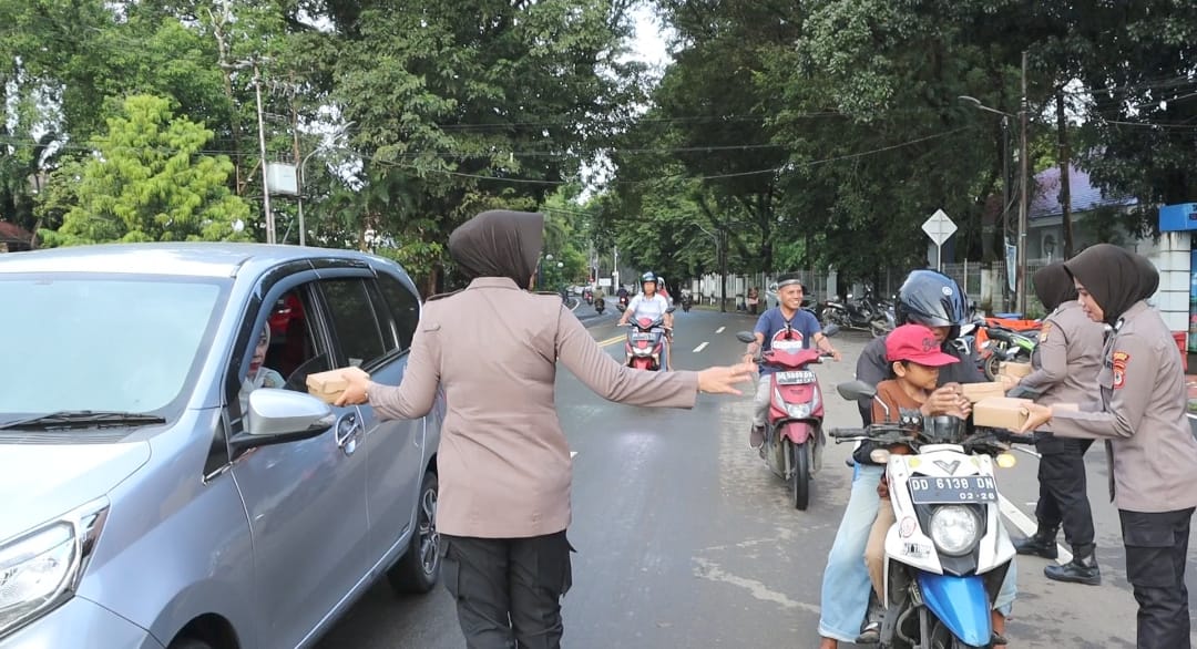 Maros – Wakil Kepala Kepolisian Resor Maros Kompol Andi Alamsyah S. S.H. M.H., bersama Personil personil Polres Maros dan berkolaborasi dengan Hasamitra, turun kejalan membagi – bagikan Takjil untuk Buka puasa hari ke 16 di bulan suci Ramadhan 1445 H, berlokasi jalan poros Bantimurung di jalan Lanto daeng Pasewang Depan polres Maros pada Hari Rabu 28 Maret 2024. Pukul 16 .30 wita, sore.