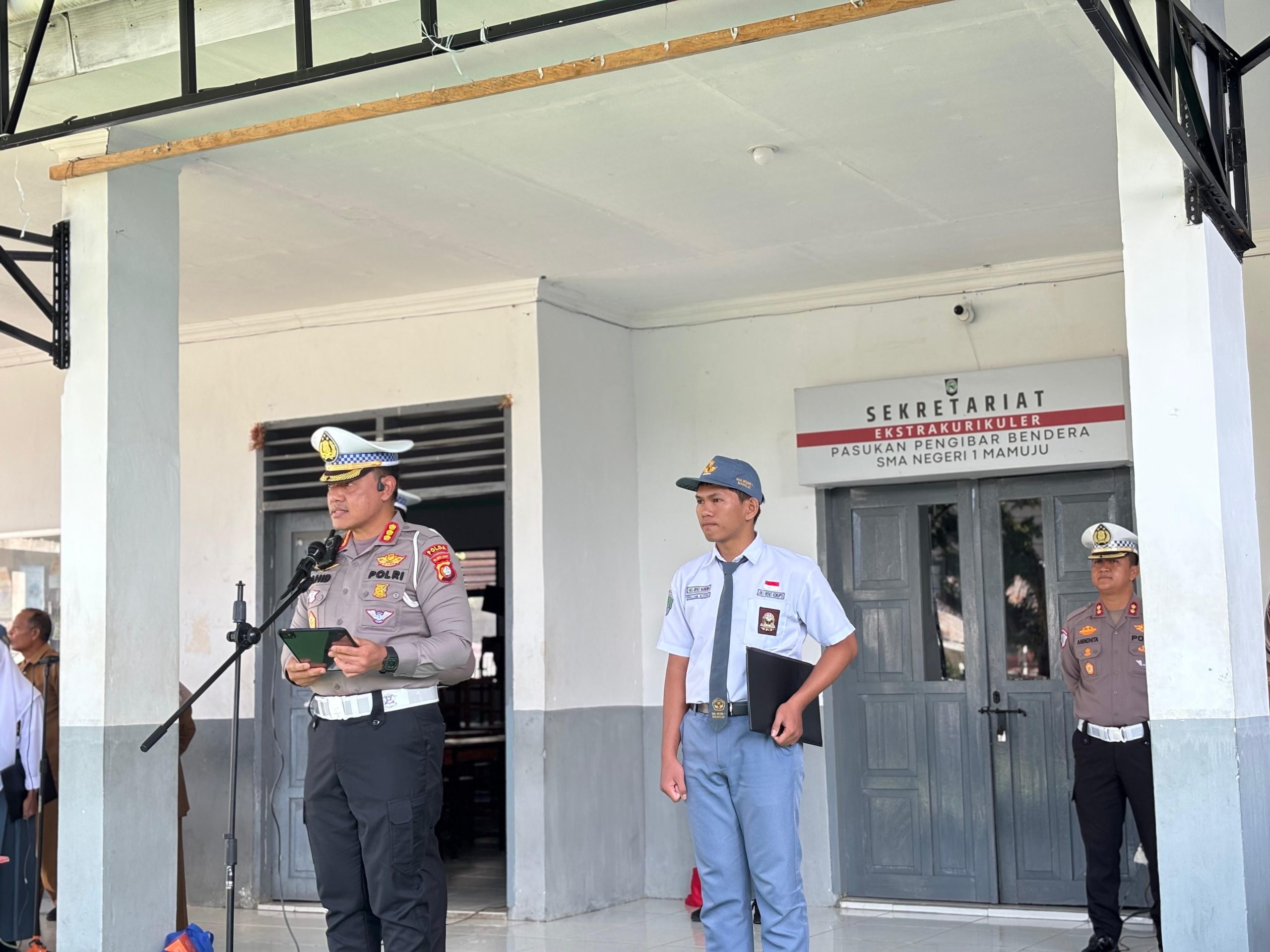 Polda Sulbar – Dalam momen pelaksanaan upacara di Sekolah Menengah Atas (SMA) Negeri 1 Mamuju, Direktur Lalu Lintas Polda Sulbar, Kombes Pol Wahid Kurniawan menginspirasi ratusan siswa/siswi, Senin (19/5/25).