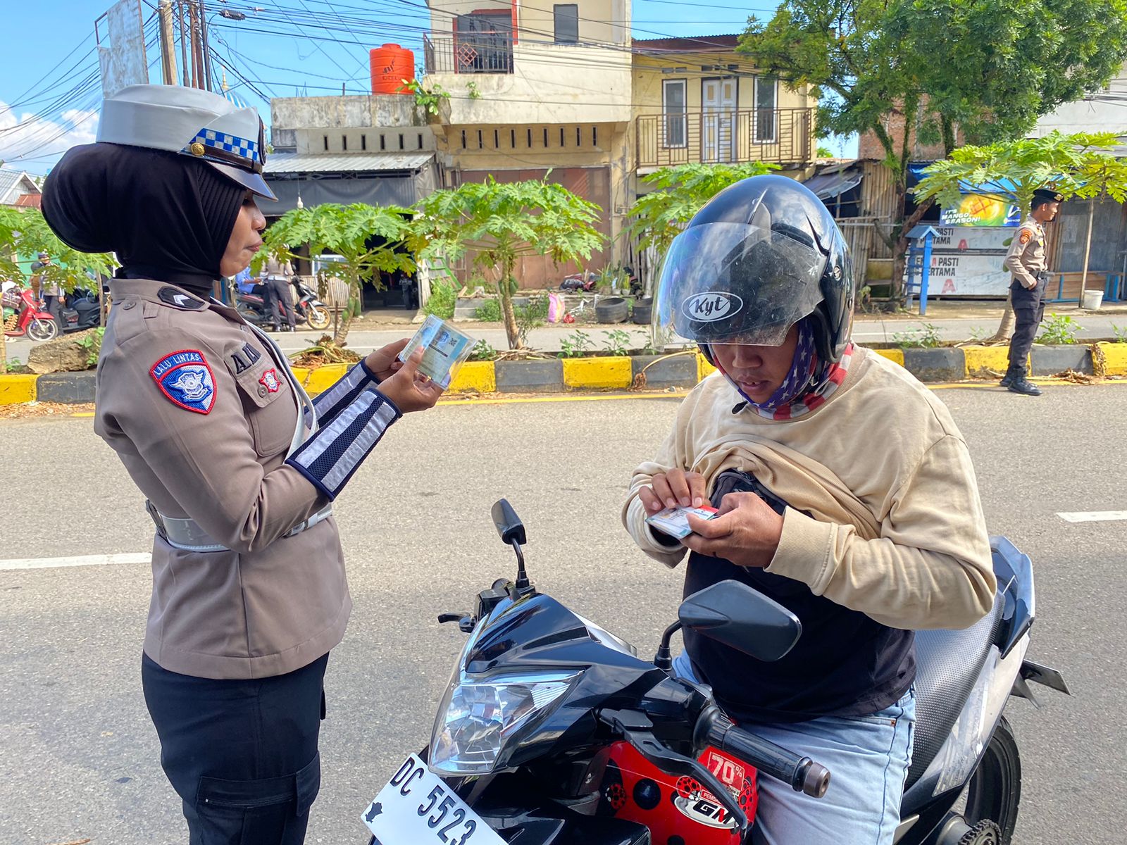 Suasana tertib dan kondusif terlihat di sepanjang jalur dua. Satu per satu pengendara yang melintas dihentikan dengan ramah. Petugas memeriksa kelengkapan surat-surat kendaraan, seperti SIM dan STNK, serta memastikan kondisi fisik kendaraan memenuhi standar keselamatan, termasuk spion, plat nomor dan penggunaan helm standar SNI bagi pengendara sepeda motor.