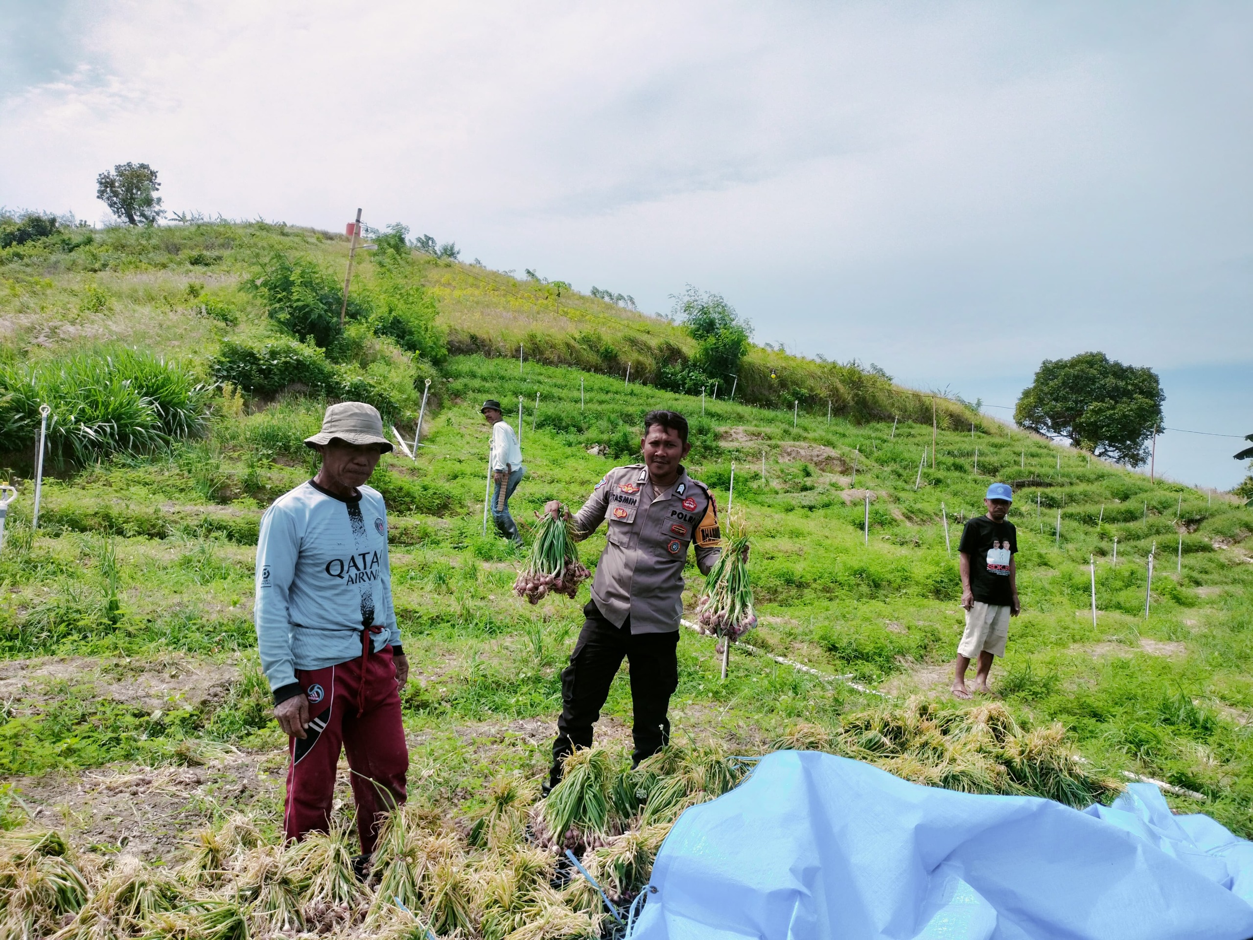 Tak hanya memberikan pendampingan, Brigpol Tasmin juga turut serta dalam proses panen bawang bersama para petani, sebagai bentuk nyata keterlibatan langsung di lapangan.