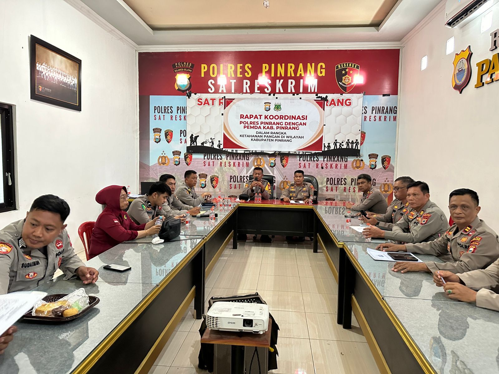 Rapat dipimpin langsung oleh Wakapolres Pinrang, Kompol MUH. IDRIS, SH, MH, dan dihadiri oleh sejumlah pejabat terkait, termasuk Kadis Pertanian, Kadis Peternakan dan Perkebunan, serta Kadis Ketahanan Pangan Kabupaten Pinrang. Para Kabag Polres Pinrang, Kasat Polres Pinrang, serta Kapolsek dari jajaran Polres Pinrang juga turut hadir.