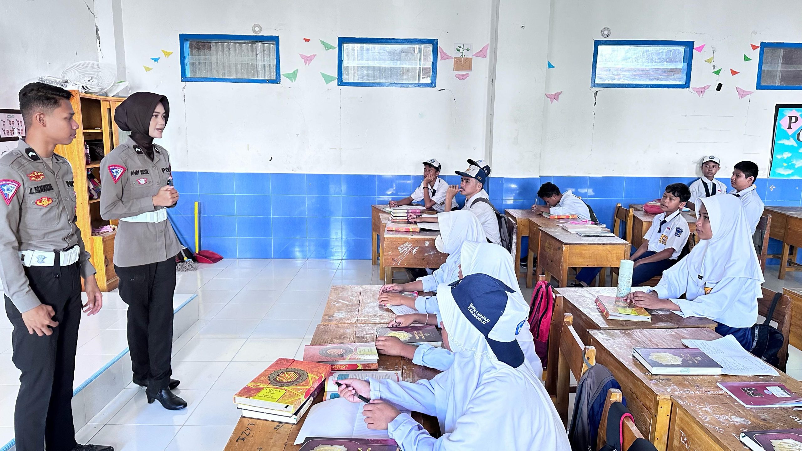 Terlihat petugas Ditlantas di SMPN 1 Mamuju memberikan penjelasan terkait aturan dan tata tertib berlalu lintas yang baik dan benar, Senin (11/3/24).