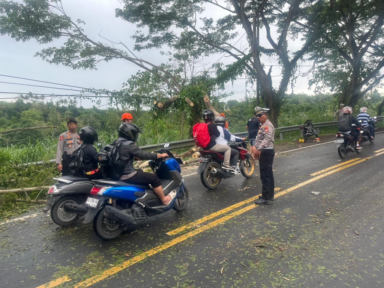 Akibat angin kencang, beberapa pohon tumbang dan menutup badan jalan sehingga menyebabkan kemacetan panjang dari kedua arah.