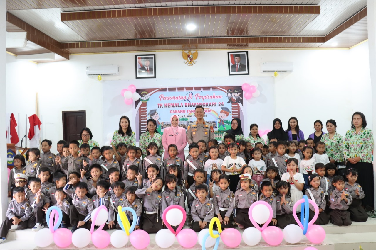Tana Toraja – Kapolres Tana Toraja AKBP Budi Hermawan, S.I.K., bersama Ketua Bhayangkari Cabang Bone Ny. Juni Budi menghadiri acara Penamatan TK Kemala Bhayangkari Cabang Tana Toraja Tahun Ajaran 2024/2025 yang berlangsung di Aula Wicaksana Laghawa Mapolres Tana Toraja, Kamis (12/06/2025).