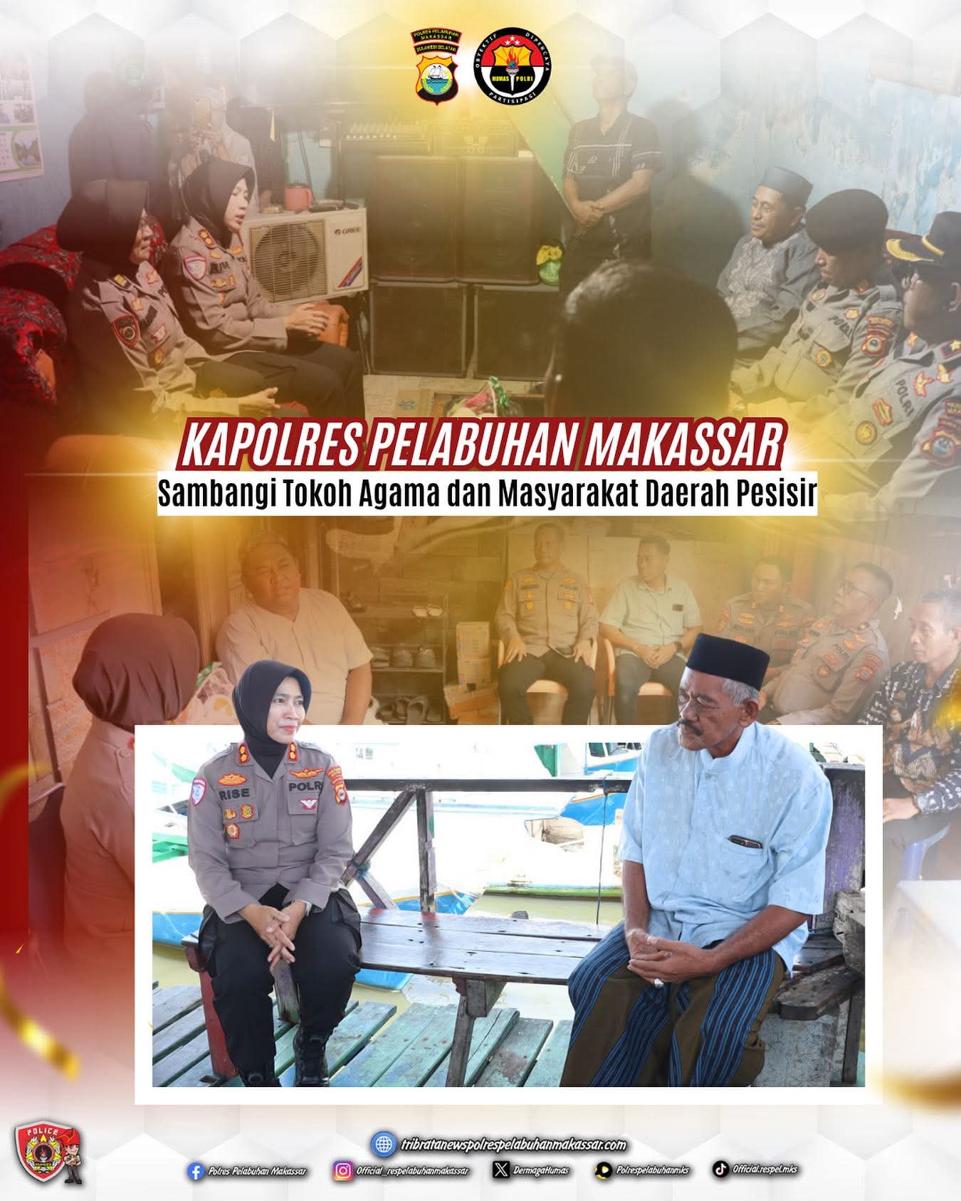 HUMDER — Suasana penuh keakraban dan kehangatan mewarnai kegiatan silaturahmi Kapolres Pelabuhan Makassar, AKBP Rise Sandiyantanti, bersama jajaran dengan para Tokoh Agama (Toga) dan Tokoh Masyarakat (Tomas) di wilayah hukum Polsek Ujung Tanah