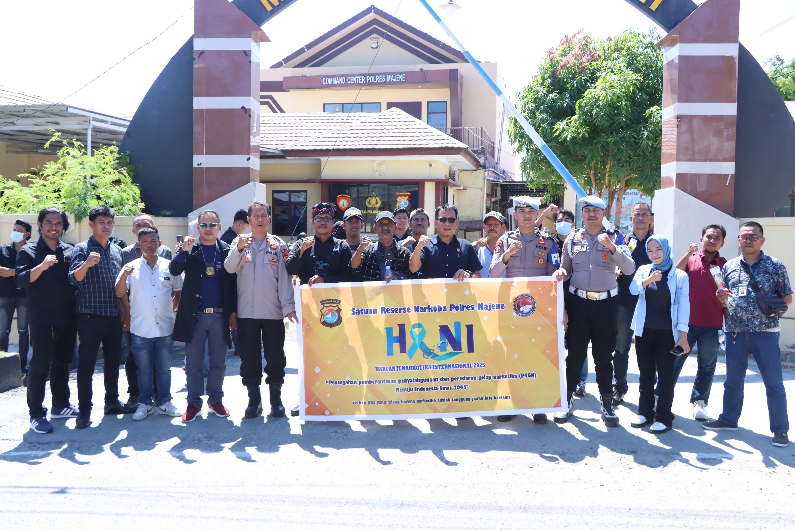 Polres Majene – Dalam rangka memperingati Hari Anti Narkotika Internasional (HANI) 2025, Satuan Reserse Narkoba Polres Majene menggelar kampanye terbuka bertema “pencegahan, pemberantasan, penyalahgunaan dan peredaran gelap narkotika (P4GN) menuju Indonesia Emas 2045” yang berlangsung di depan Mako Polres Majene, Kamis (26/6/25).