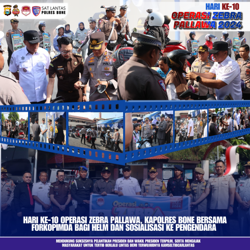Kapolres Bone juga menyampaikan, pelaksanaan Operasi Zebra Pallawa 2024 bersamaan dengan pelaksanaan operasi Mantap Praja, sehingga saat pembagian helm juga dilakukan kegiatan cooling system dengan memberikan himbauan tentang Pilkada Aman, Damai dan Sejuk.