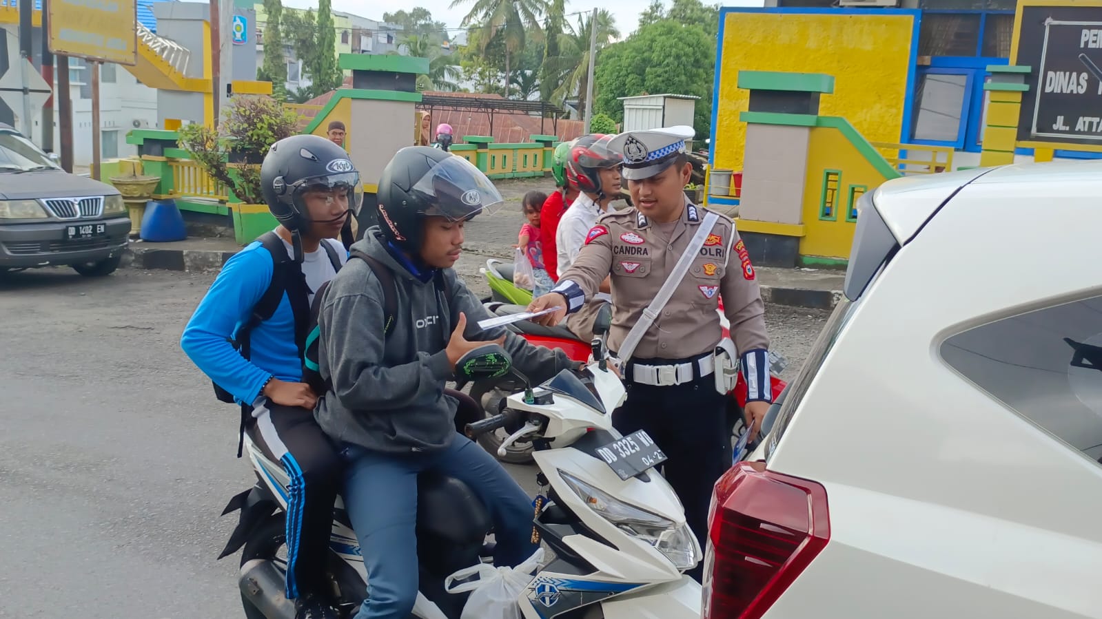 Selain giat penindakan (Belangko teguran) juga diadakan pembagian brosur tertib berlalu lintas.