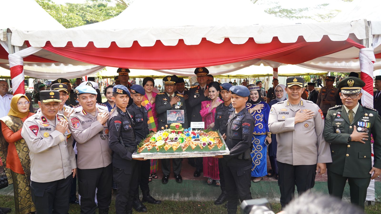 Polda Sulbar – Suasana haru dan penuh suka cita menyelimuti peringatan HUT TNI ke-79 di Korem 142 Tatag, Sulawesi Barat. Tak hanya hadir sebagai tamu kehormatan, Kapolda Sulbar Irjen Pol Adang Ginanjar bersama Ny. Miranti Adang, Ketua Bhayangkari dan seluruh pejabat utama Mapolda juga memberikan kejutan manis yang membuat suasana semakin meriah.