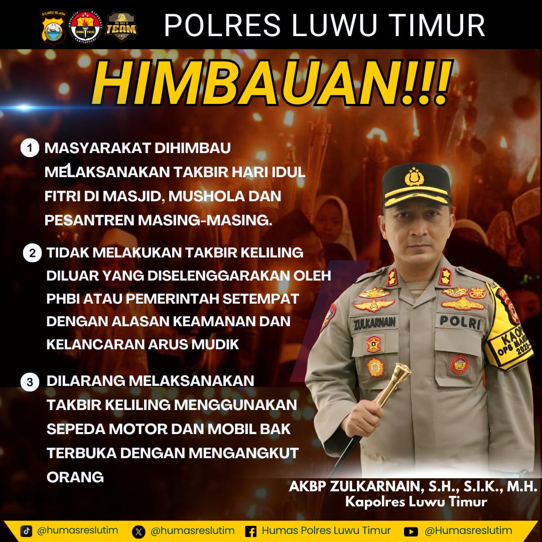 Luwu Timur -Polres Luwu Timur merevisi himbauan larangan takbir keliling Idul Fitri 1446 Hijriah yang diprediksi pada Minggu malam 30 Maret 2025.