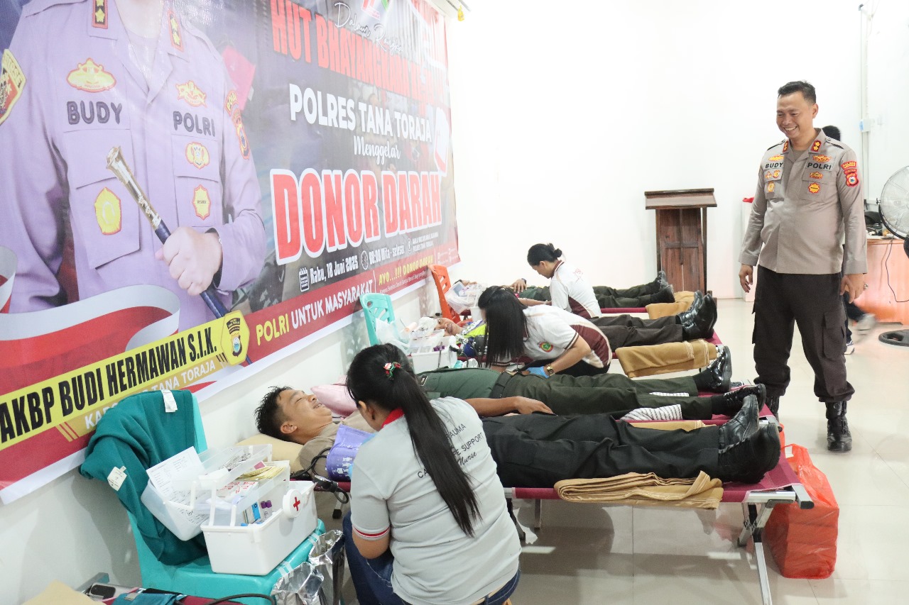 Tana Toraja – Sebagai wujud kepedulian akan sesama dan dalam rangka menyambut Hari Ulang Tahun (HUT) Bhayangkara Ke-79 yang jatuh pada 1 Juli 2025 mendatang, Polres Tana Toraja (Tator) menggelar aksi donor darah di Aula Wicaksana Laghawa Mapolres Tana Toraja, Rabu (18/06/25) pagi tadi.