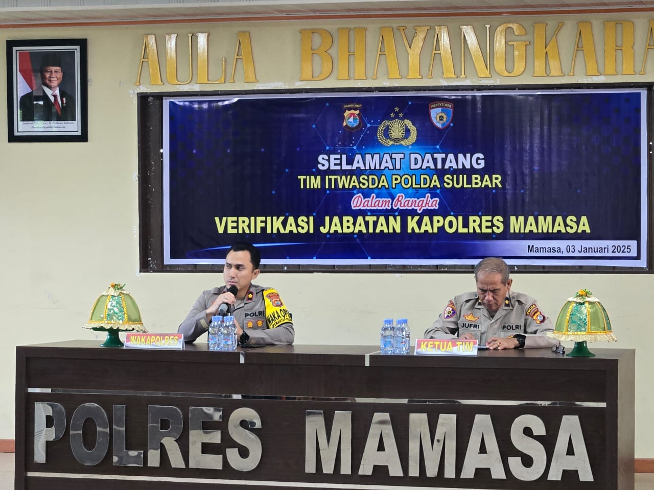 POLRES MAMASA – Tim Verifikasi Inspektorat Pengawasan Daerah (Itwasda) Polda Sulawesi Barat melakukan kunjungan kerja ke Polres Mamasa dalam rangka verifikasi serah terima jabatan (Sertijab) Kapolres Mamasa. Kegiatan ini berlangsung di Aula Polres Mamasa pada Jumat 03 Januari 2025