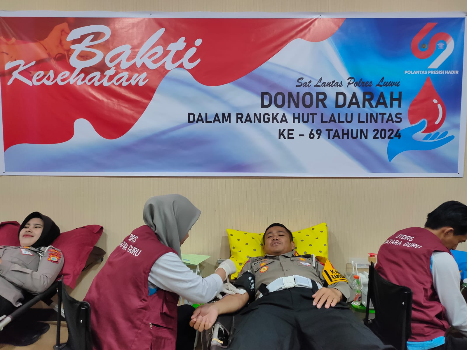 Luwu – Dalam rangka jelang peringatan Hari Lalu Lintas Bhayangkara Ke-69, Satlantas Polres Luwu dan Personil Polres Luwu lainnya gelar aksi kemanusiann donor darah, bertempat di Ruang Command Center Polres Luwu. Kamis (5/9/2024).