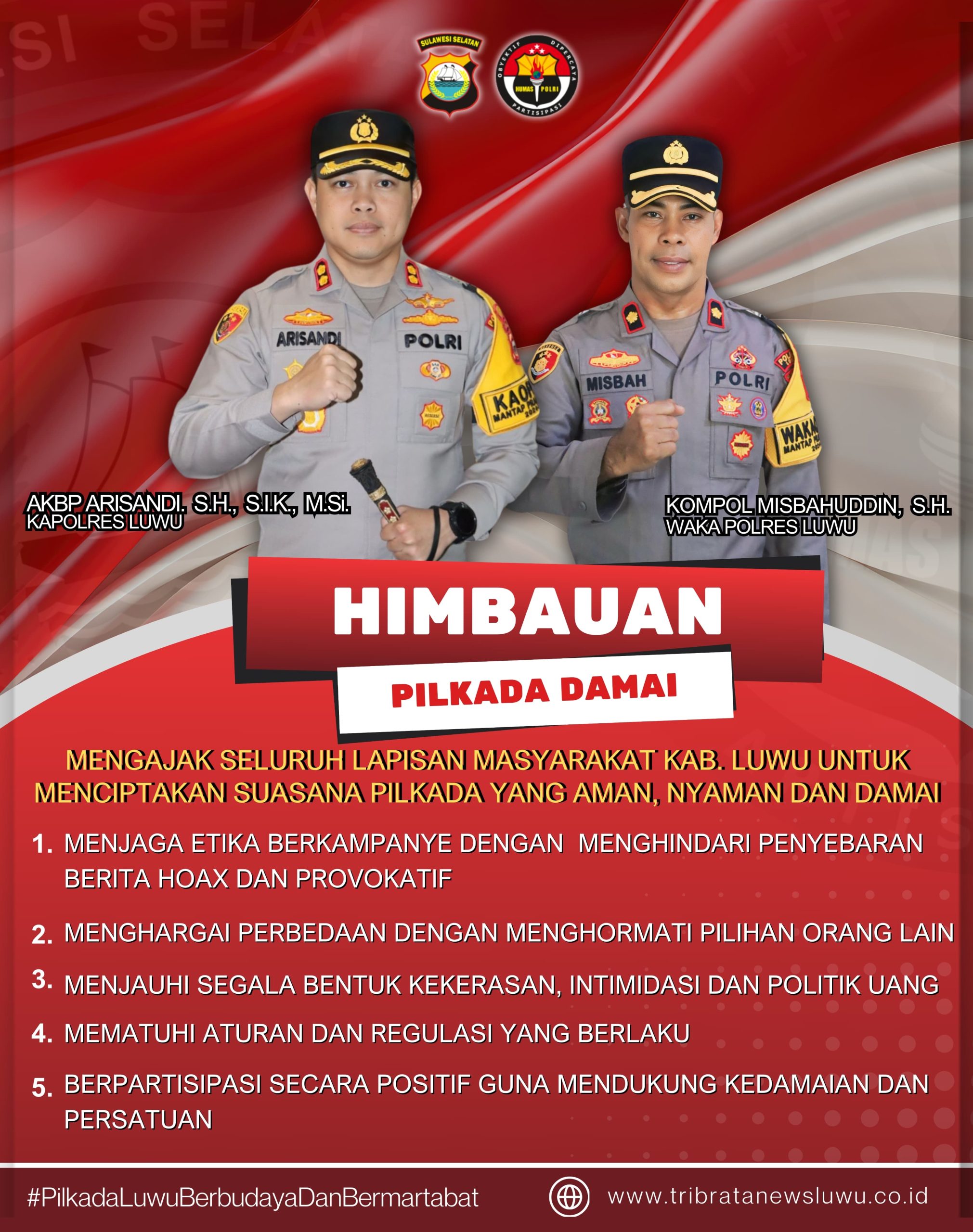 Luwu – Tahapan pemilihan Calon Bupati dan Wakil Bupati Kabupaten Luwu terus bergulir, Kapolres Luwu AKBP Arisandi, S.H., S.I.K., M.Si. telah mengeluarkan himbauan penting terkait pelaksanaan Pilkada Serentak 2024 demi terpeliharanya situasi kamtibmas yang kondusif.