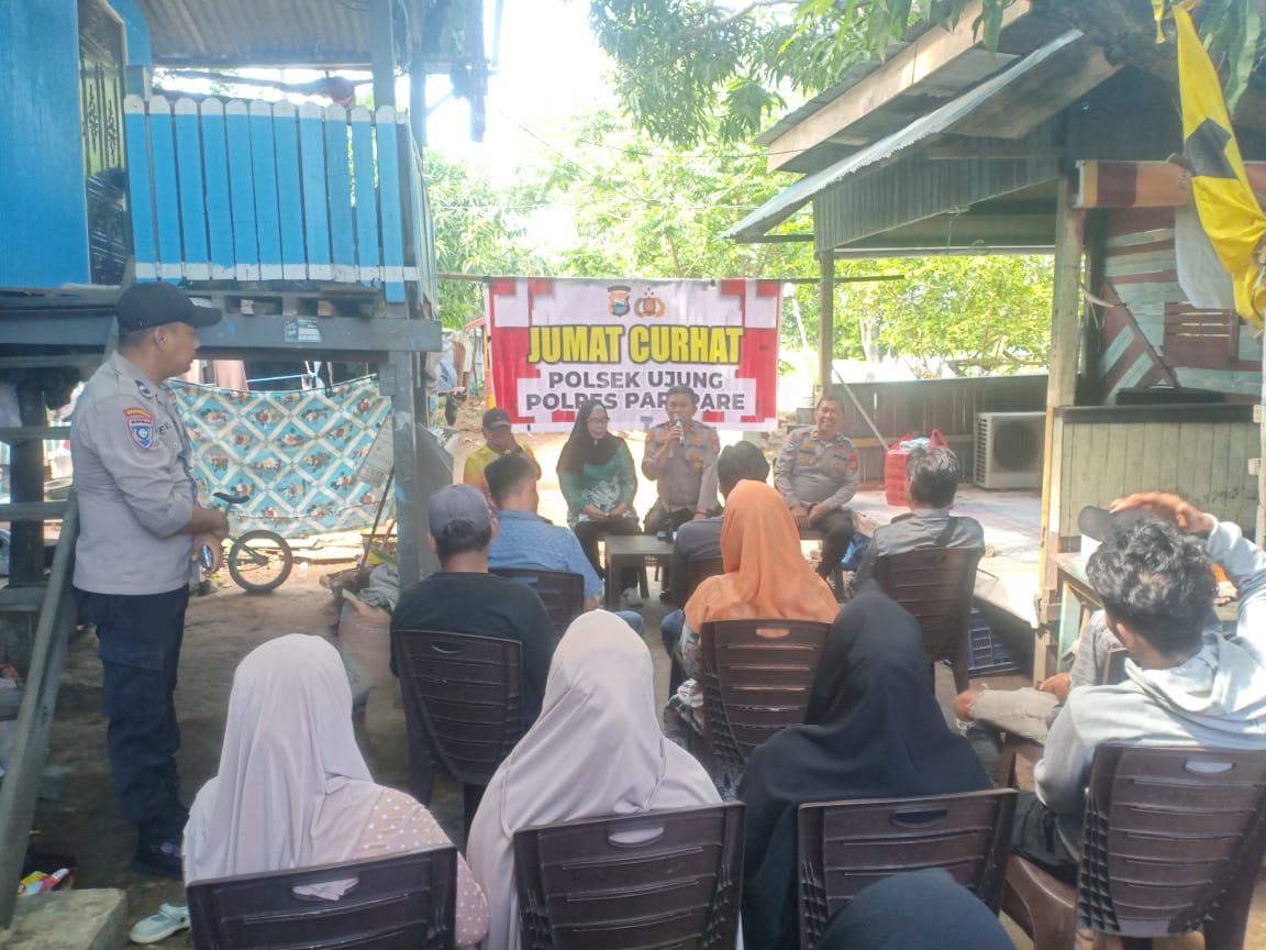 Parepare — Polsek Ujung Polres Parepare menggelar kegiatan Jumat Curhat di Kelurahan Labukkang, Kecamatan Ujung, Kota Parepare, tepatnya di kediaman Jufri, Ketua RT 002/RW 007 di Jl. Singa. Kegiatan ini dihadiri oleh sekitar 15 warga setempat, bertujuan untuk menyerap aspirasi dan permasalahan masyarakat setempat yang membutuhkan penanganan secepatnya. Jumat (15/11/2024) pagi.