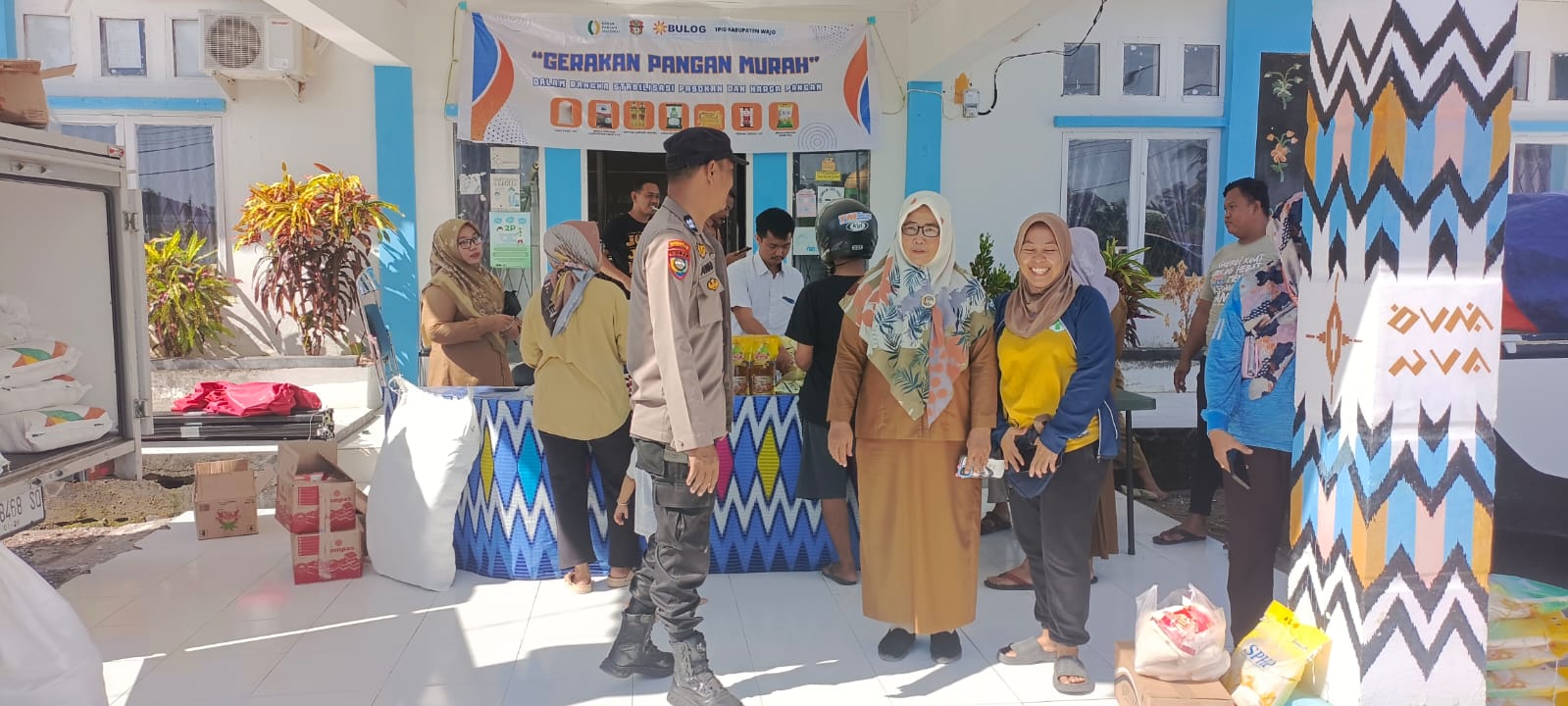 WAJO _ Kanit Reksrim Polsek Pammana Aiptu Sukiman SH bersama Bhabinkamtibmas Aiptu Awan. D melaksanakan pemantauan sekaligus pengamanan kegiatan pasar murah, yang digelar di Kantor Kecamatan Pammana, Kabupaten Wajo, Selasa (6/2/2024).