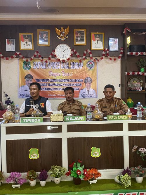 SIDRAP – Kanit Tipikor Polres Sidrap Ipda Amdaryono Saputra ,S.H berikan materi pada pelaksanaan kegiatan Safari Apdesi dengan tema memperkuat sinergi dengan Aparat Penegak Hukum untuk transparansi dan penegakan hukum yang berkelanjutan.