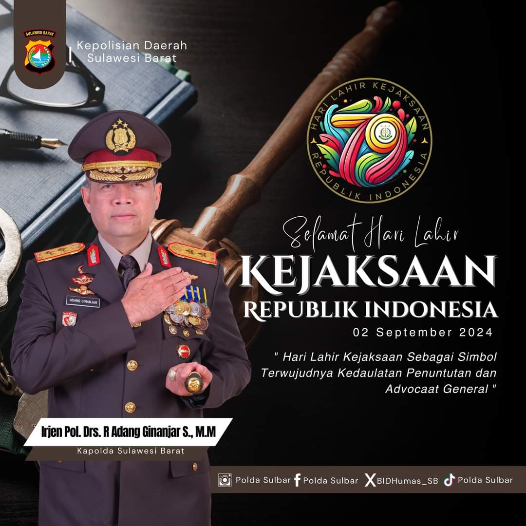 Mamuju – Kapolda Sulawesi Barat, Irjen Pol. Drs. R. Adang Ginanjar S., M.M., menyampaikan ucapan selamat kepada seluruh jajaran Kejaksaan Republik Indonesia dalam rangka peringatan Hari Lahir Kejaksaan yang jatuh pada hari ini, 2 September 2024.