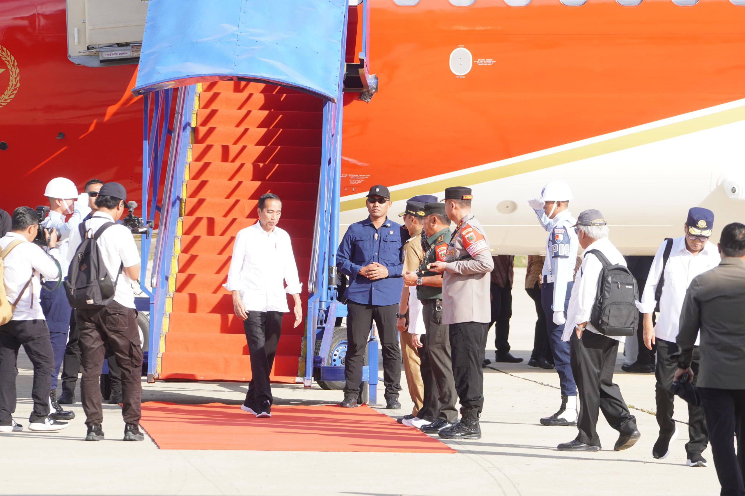Polda Sulbar – Kapolda Sulbar Irjen Pol Adang Ginanjar bersama PJ. Gubernur, Danrem 142 Tatag, Ketua DPRD Sulbar dan forkopimda lainnya memberikan sambutan hangat kepada Presiden RI Joko Widodo saat tiba di Bandar Udara Tampa Padang Mamuju, Senin sore (22/2/24).