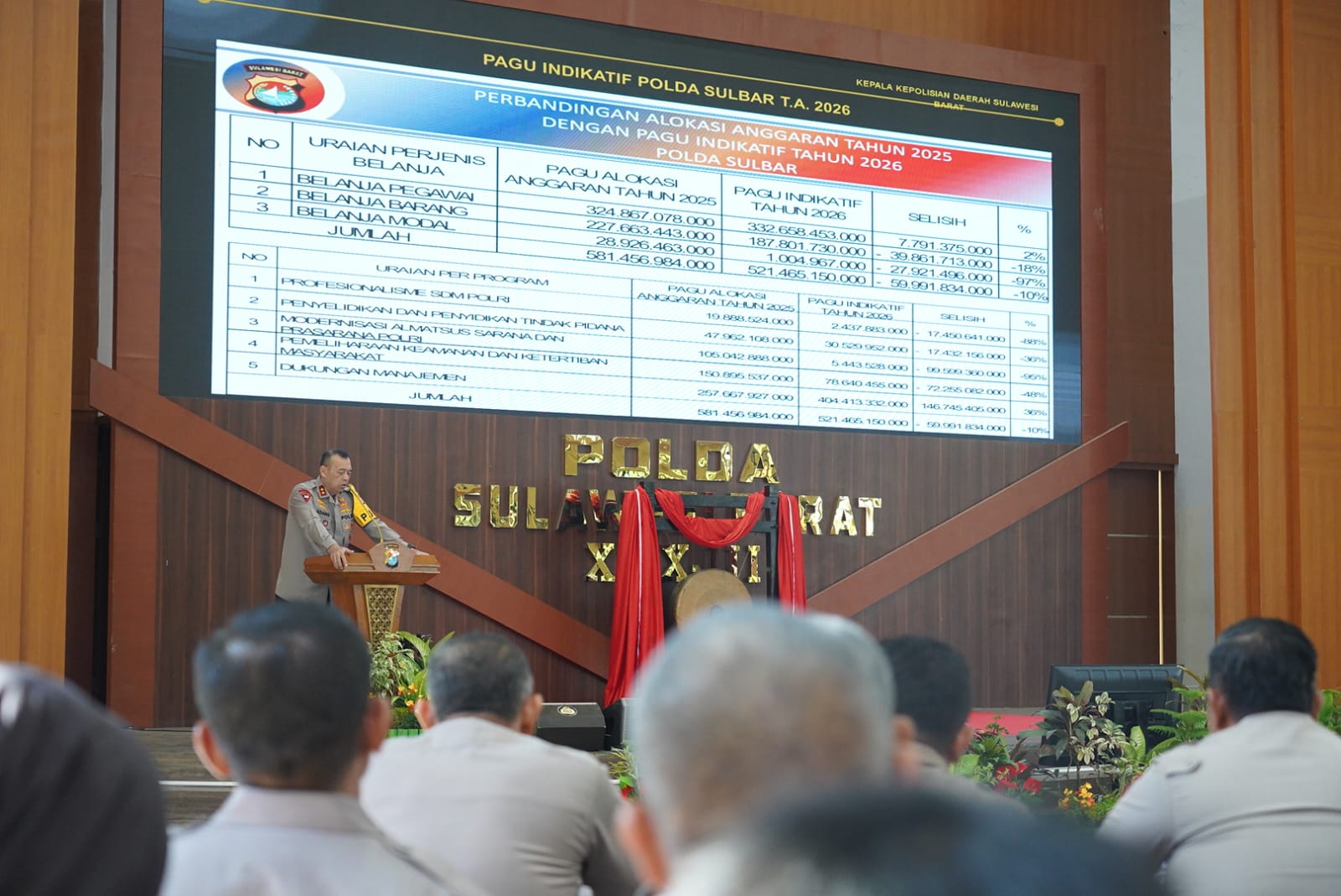 Musrembang ini juga menjadi forum strategis untuk membahas penjabaran program prioritas Polda Sulbar tahun 2026 dengan pagu indikatif sebesar Rp 521.465.150.000. Angka ini menunjukkan penurunan signifikan sebesar Rp 59.991.834.000 dibandingkan pagu anggaran tahun 2025 yang mencapai Rp 581.456.984.000.