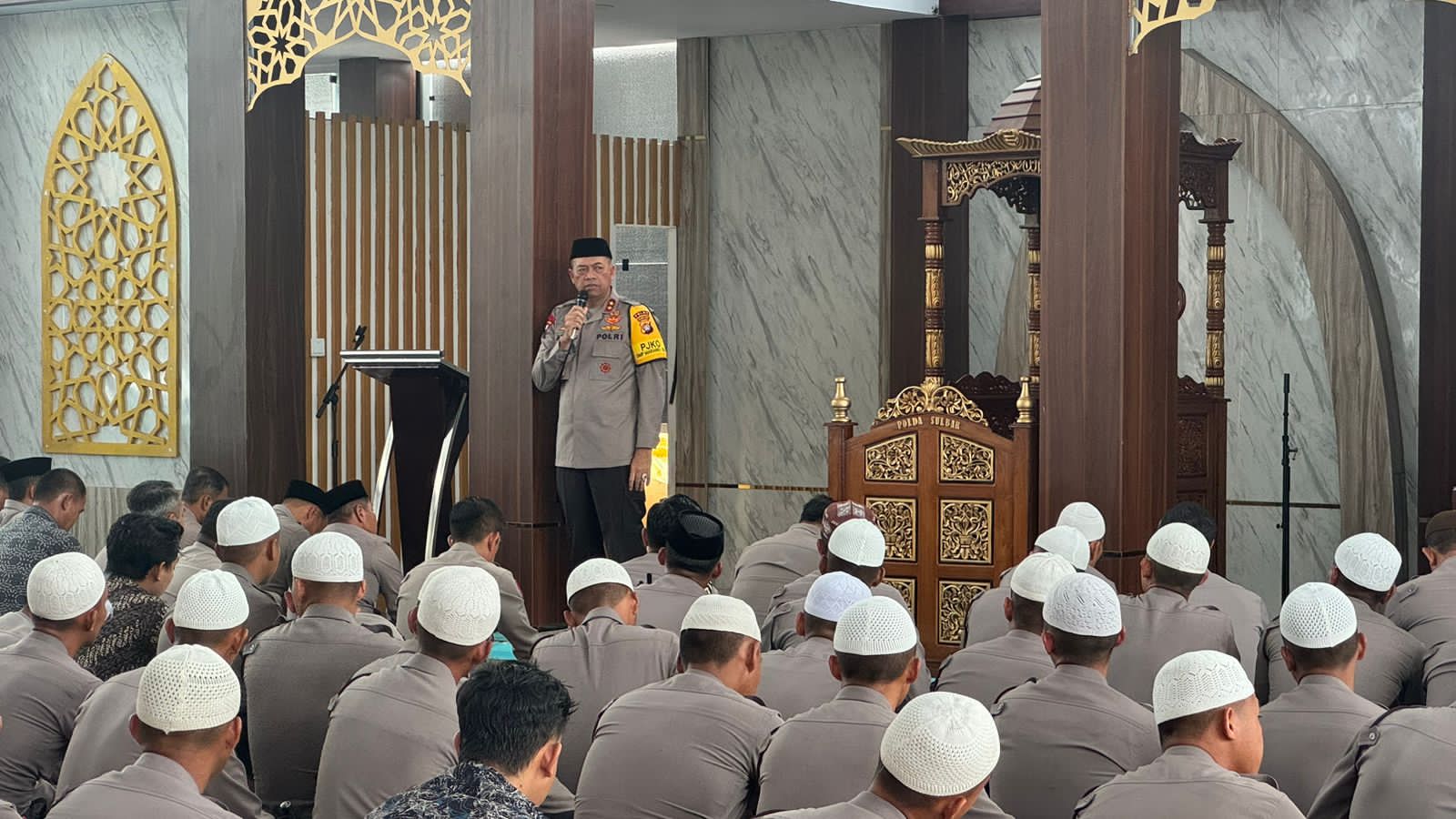 Polda Sulbar – Dalam program Jumat curhat, Kapolda Sulbar Irjen Pol Adang Ginanjar usai jumatan menyampaikan pesan penting kepada seluruh personel Polda Sulbar untuk menjaga netralitas dan Marwah Polri selama perhelatan Pilkada 2024, Jumat (30/8/24) di Masjid Jabal Rahmah Mapolda.
