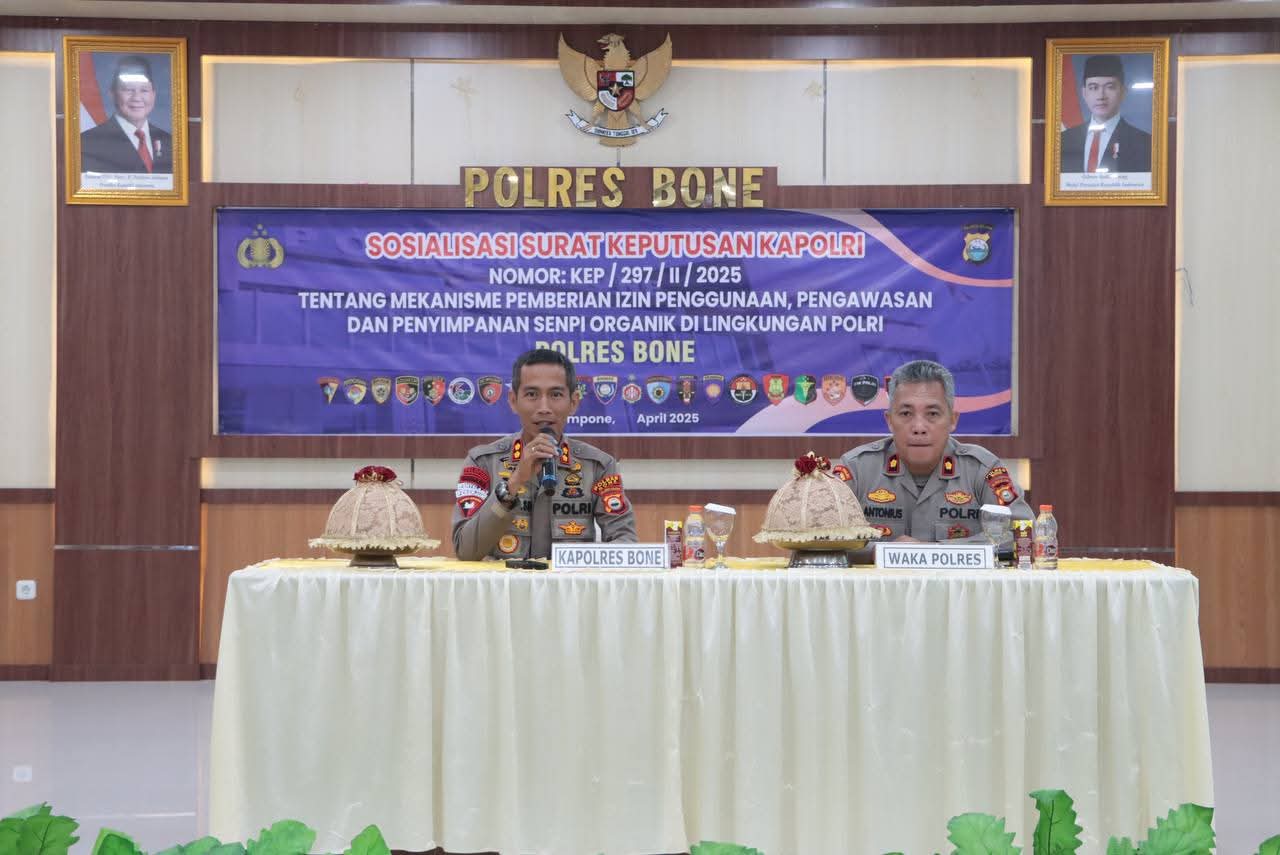 Watampone,– Kapolres Bone AKBP Sugeng Setio Budhi, S.I.K., M.Tr.Opsla. secara resmi membuka kegiatan Sosialisasi Tentang Mekanisme Pemberian Izin Penggunaan, Pengawasan, dan Penyimpanan Senjata Api (Senpi) di Lingkungan Polri, yang berlangsung di Aula Sarja Arya Racana Mapolres Bone, pada Rabu (22/4/2025).