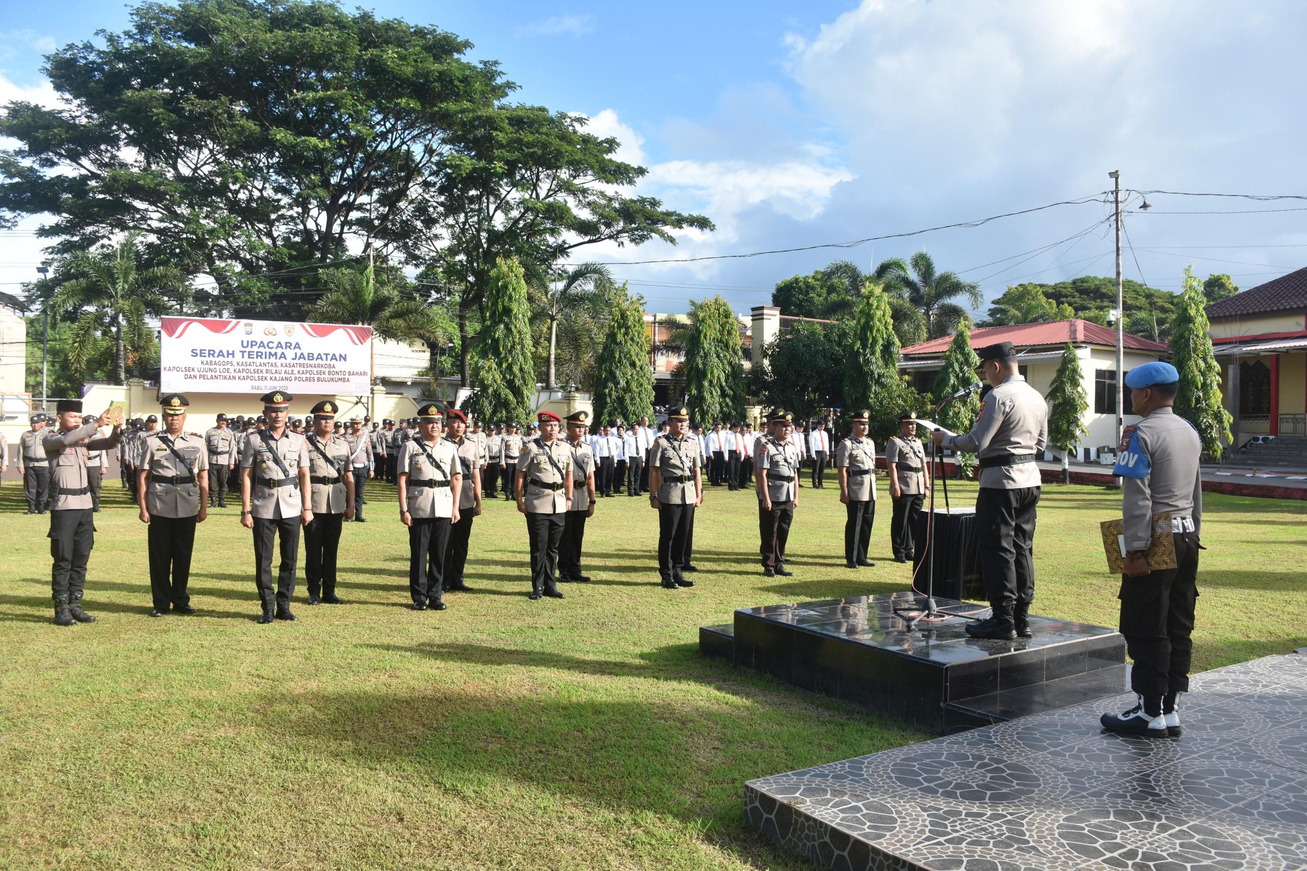 BULUKUMBA – Kapolres Bulukumba, AKBP Restu Wijayanto, S.I.K., memimpin langsung upacara serah terima jabatan (Sertijab) sejumlah perwira di lingkungan Polres Bulukumba. Upacara digelar di lapangan Mapolres Bulukumba pada Rabu, 11 Juni 2025, dan dihadiri oleh Wakapolres Kompol Syafaruddin, S.H., para Pejabat Utama (PJU), perwira, bintara, serta ASN Polres Bulukumba.