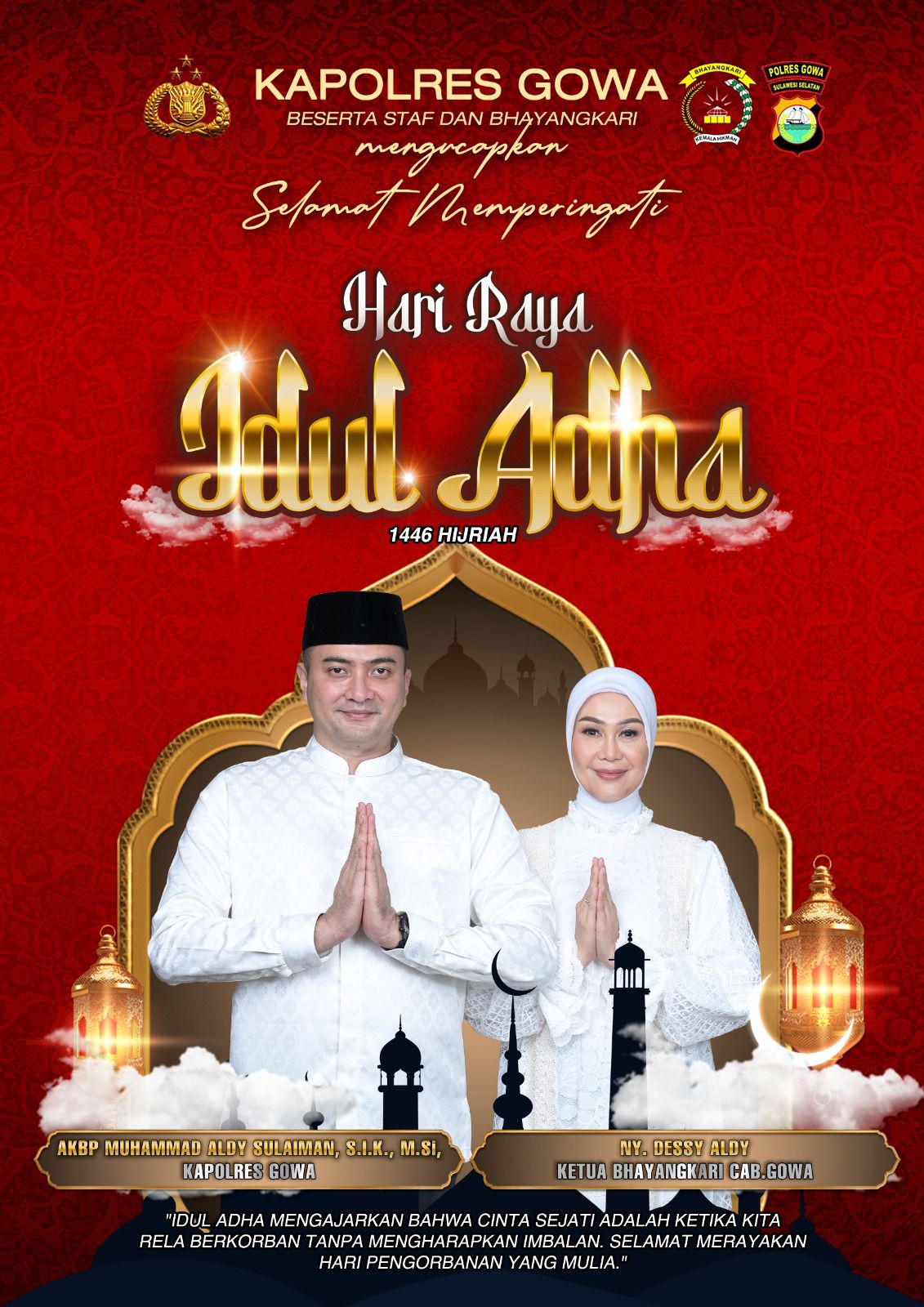 Kapolres Gowa, AKBP Muh. Aldy Sulaiman, S.I.K., M.Si., bersama seluruh staf dan Bhayangkari Cabang Gowa menyampaikan ucapan Selamat Memperingati Hari Raya Idul Adha 1446 Hijriah kepada seluruh umat Muslim, khususnya masyarakat Kabupaten Gowa.