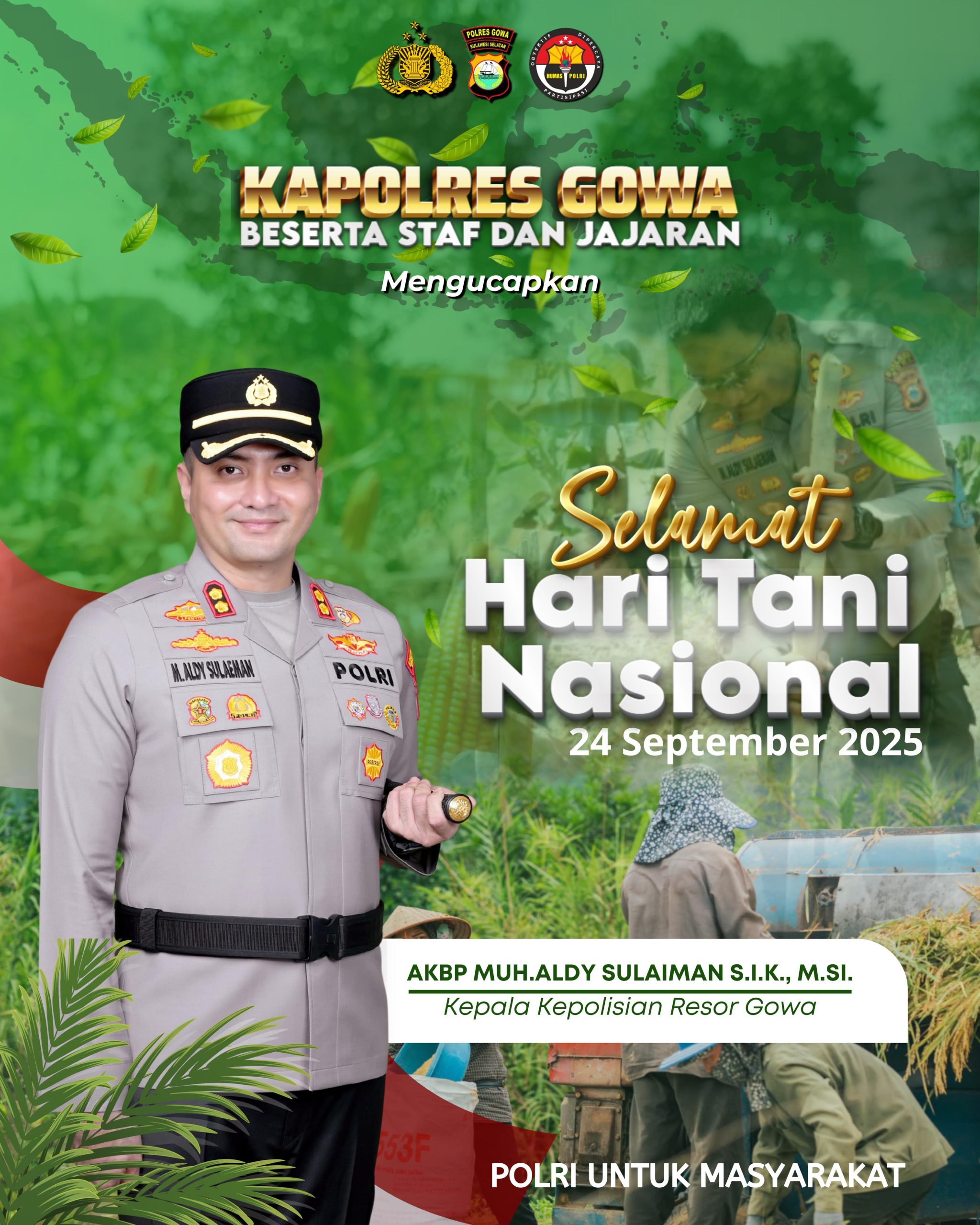 Kapolres Gowa, AKBP Muh. Aldy Sulaiman, S.I.K., M.Si., bersama staf dan jajaran Polres Gowa, mengucapkan Selamat Hari Tani Nasional yang diperingati setiap 24 September.