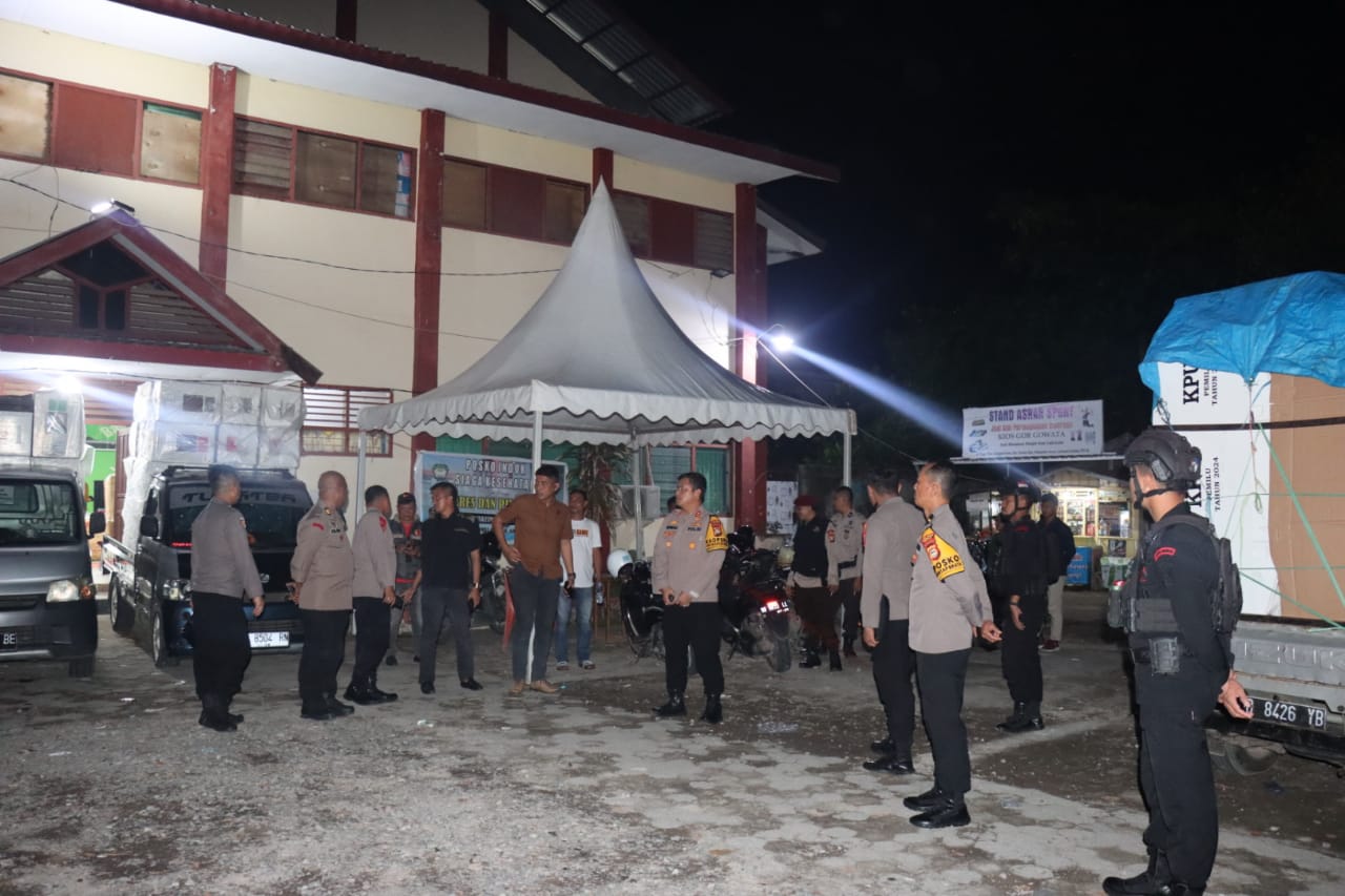 Kapolres Gowa AKBP R.T.S Simanjuntak, S.H., S.I.K., M.M., M.I.K., didampingi beberapa PJU Polres Gowa melakukan pengecekan di Gudang Logistik Pemilu 2024 di PPK Somba Opu, Pallangga, Bajeng dan Bontonompo, Kamis (16/02/2024) Malam.