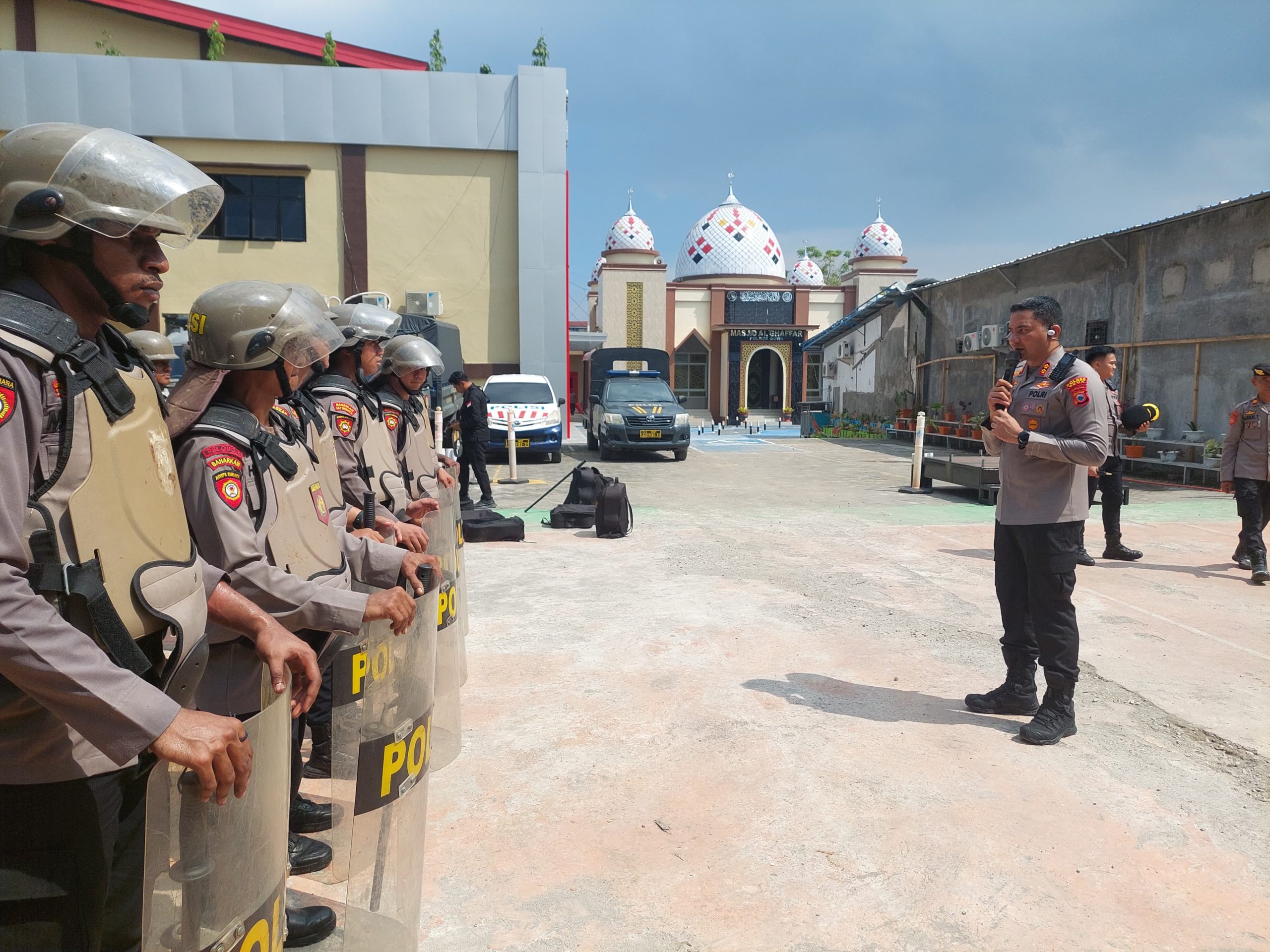 Kapolres Gowa menyampaikan bahwa latihan ini merupakan langkah preventif dalam rangka mengantisipasi kemungkinan terjadinya aksi unjuk rasa yang berpotensi mengganggu ketertiban umum.