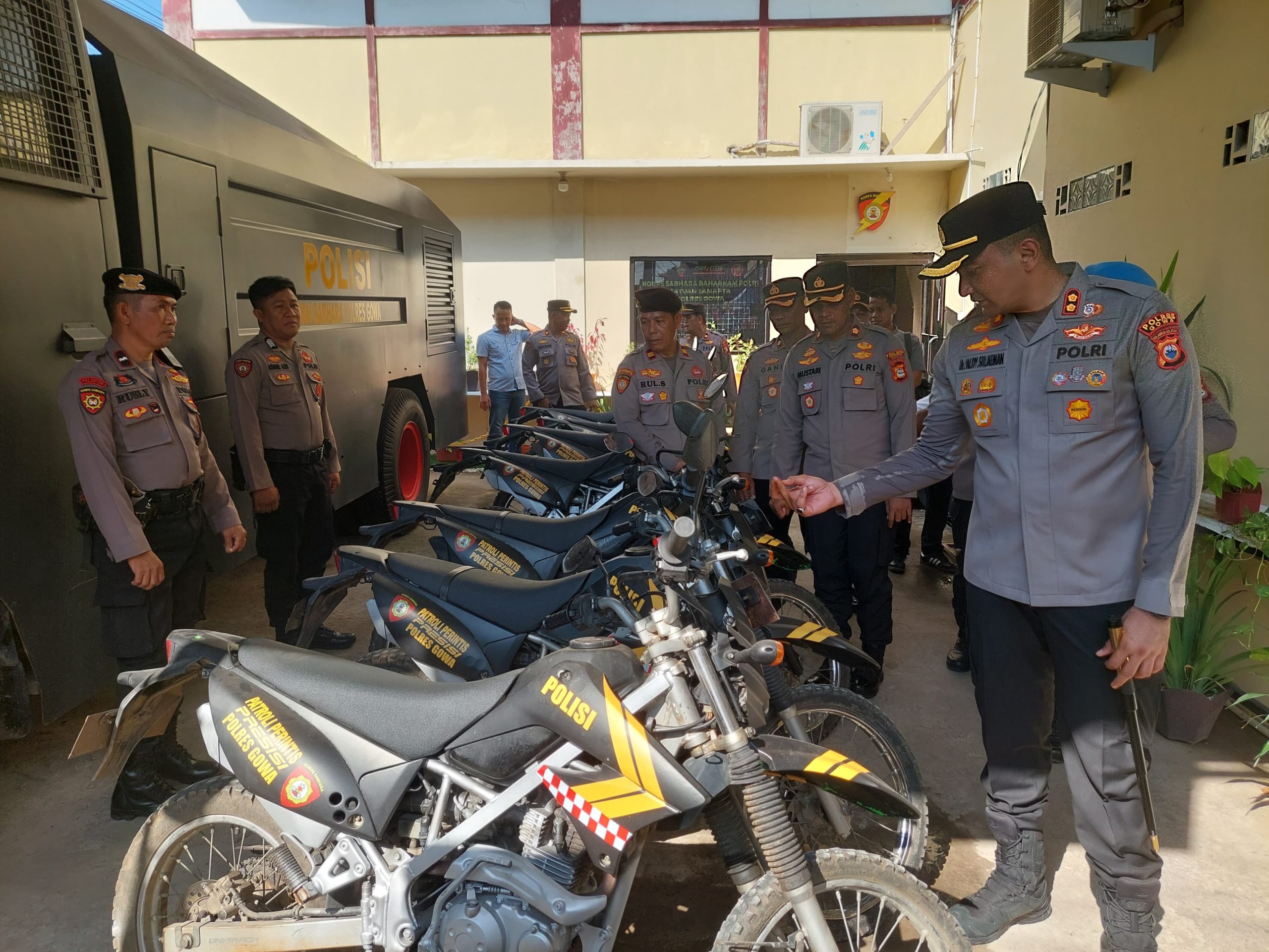 GOWA-Kapolres Gowa, AKBP Muhammad Aldy Sulaiman, S.I.K., M.Si., didampingi oleh Wakapolres Gowa KOMPOL Gani, S.H., M.H., bersama para Pejabat Utama (PJU) Polres Gowa, melaksanakan inspeksi mendadak (sidak) terhadap kendaraan dinas milik Satuan Samapta (Sat Samapta) Polres Gowa, Rabu (11/06/2025).