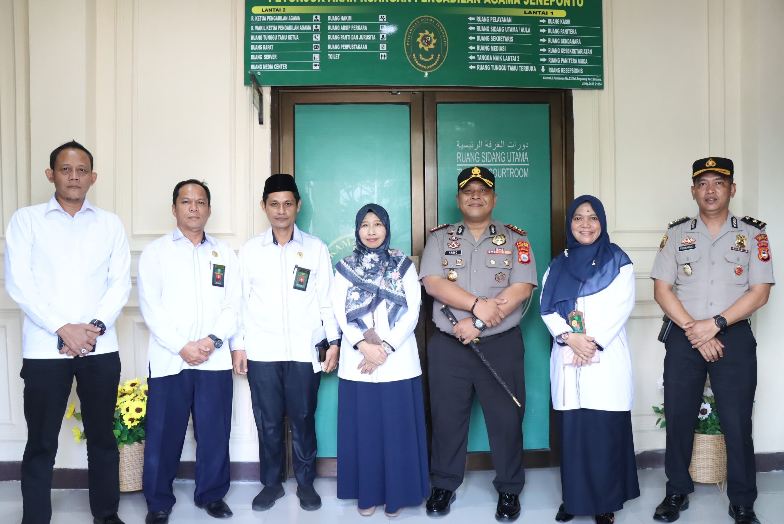 Dari Kantor Bupati, rombongan Kapolres menuju ke kantor Pengadilan Agama Jeneponto. Kapolres Haryo Basuki diterima langsung oleh Ketua Pengadilan Agama Kab. Jeneponto Fadilah, S.Ag., M.H., di ruang kerjanya beserta staf. Seperti pada kunjungan sebelumnya, Kapolres memperkenalkan diri dan menyampaikan harapan untuk terjalinnya kerja sama yang baik, khususnya dalam memberikan pelayanan terbaik kepada masyarakat Kabupaten Jeneponto.