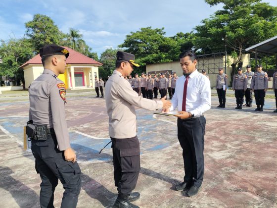 Jeneponto – Kapolres Jeneponto AKBP Widi Setiawan, S.I.K., M.I.K., memberikan penghargaan kepada personel yang menunjukkan kinerja luar biasa dalam menjalankan tugasnya. Penghargaan tersebut diberikan kepada Aipda Syam Suryadi Syarif, S.H., yang bertugas di Fungsi Reskrim sebagai Kaur Identifikasi Polres Jeneponto. Acara penghargaan berlangsung dalam apel pagi yang digelar pada Senin, 21 April 2025, di halaman Mapolres Jeneponto dan dihadiri oleh para pejabat utama (PJU), perwira, bintara, serta ASN Polres Jeneponto.