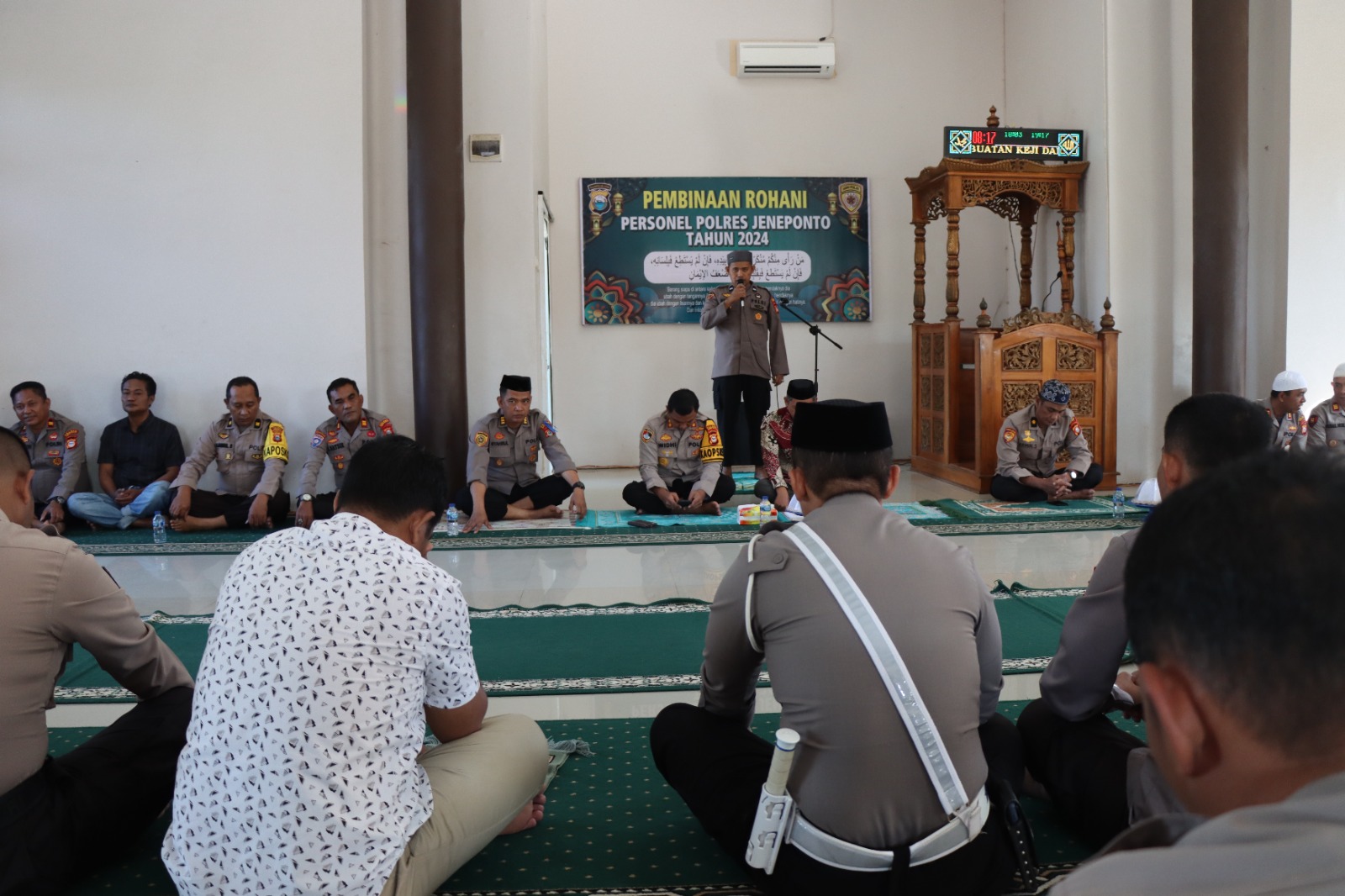 Jeneponto- Kapolres Jeneponto AKBP Widi Setiawan, S.IK., M.IK. menggelar pembinaan kerohanian Mental (Binrohtal) perdana bersama personel di Masjid Nur Asy – Syurthi Polres Jeneponto. Kegiatan rutin ini dilaksanakan setiap Kamis pagi dan melibatkan seluruh personel yang beragama Islam, Kamis, 18/7/2024.