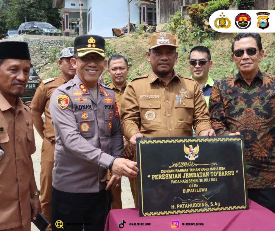 Luwu – Kapolres Luwu AKBP Adnan Pandibu, S.H., S.I.K., hadiri kegiatan peresmian dan serah terima Jembatan Kadundung dan Jembatan To’barru yang berlangsung di Desa Kadundung, Kecamatan Latimojong, Kabupaten Luwu, Senin (28/07/2025).