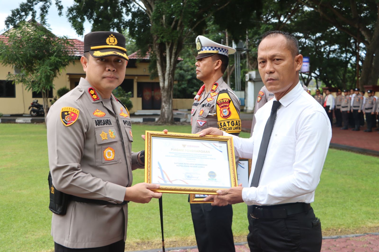 Luwu – Kapolres Luwu, AKBP Arisandi, memberikan piagam penghargaan kepada Satuan Lalu Lintas (Satlantas) dan Satuan Intelijen dan Keamanan (Satintelkam) Polres Luwu dalam apel pagi yang berlangsung di halaman Apel Mapolres Luwu, Senin (20/01/2025).