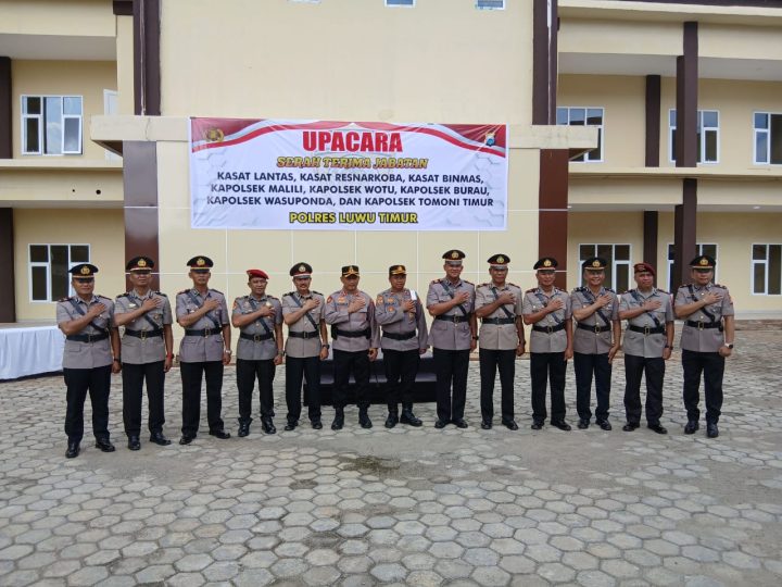 LUWU TIMUR – Kapolres Luwu Timur, AKBP Zulkarnain memimpin upacara serah terima jabatan (Sertijab) Kasat Lantas, Kasat Resnarkoba, Kasat Binmas, Kapolsek Malili, Kapolsek Wotu, Kapolsek Burau, Kapolsek Wasuponda dan Kapolsek Tomoni Timur di Mako Polres Luwu Timur yang baru, Jl Soekarno Hatta, Desa Puncak Indah, Kecamatan Malili, Rabu (11/6/2025).